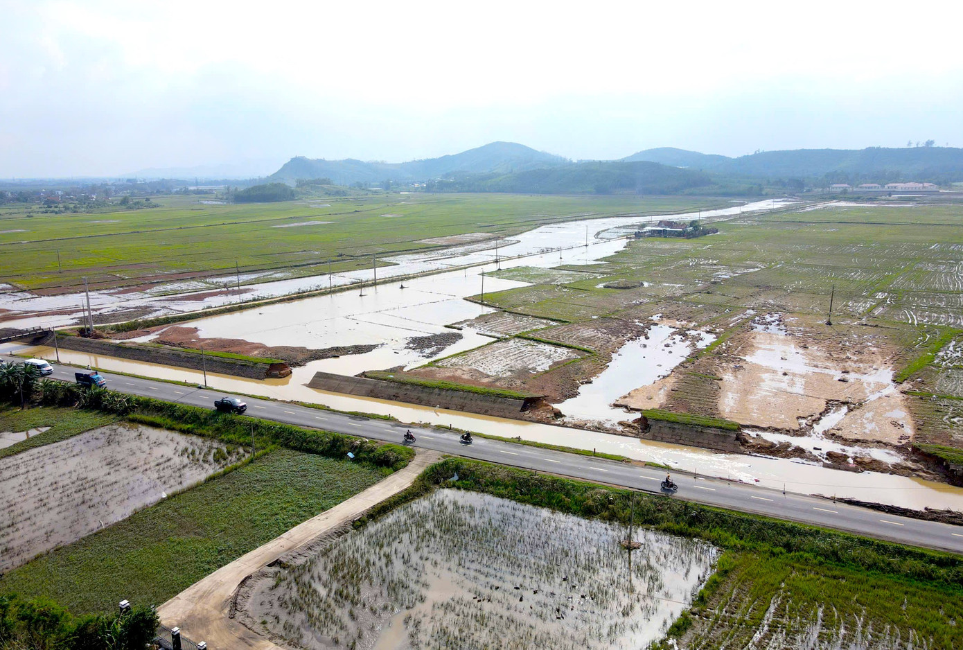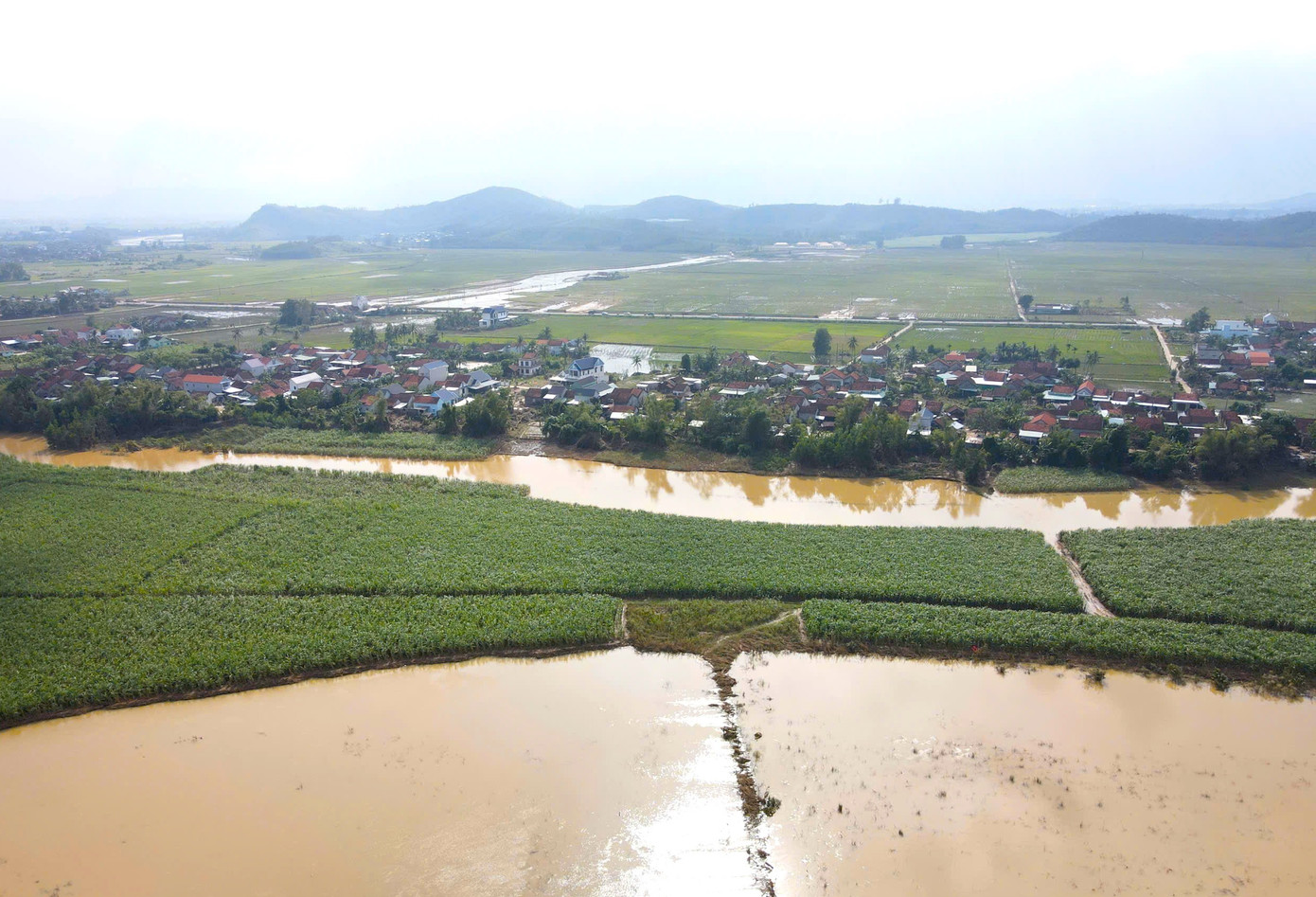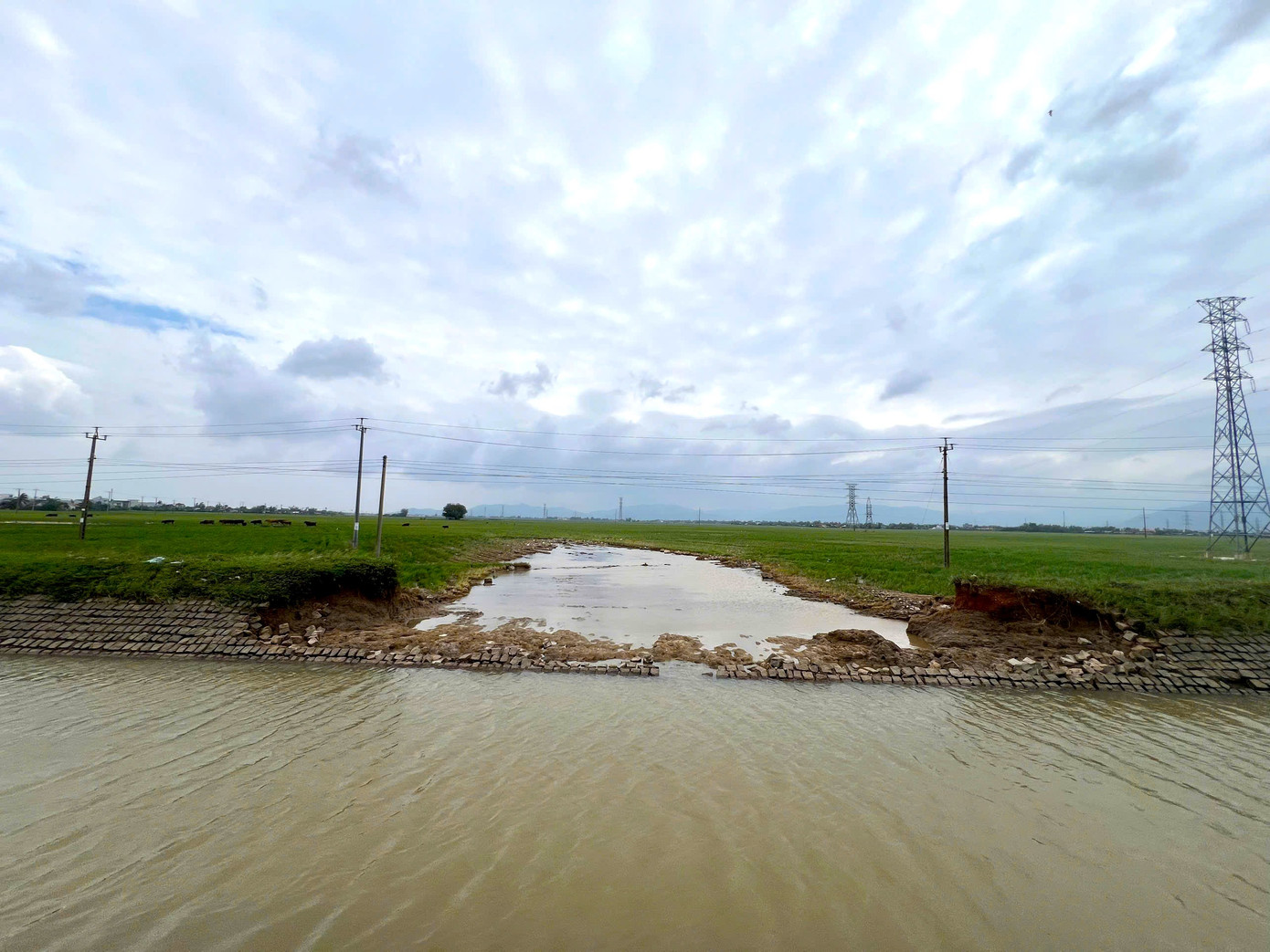 Hiện trường cho thấy, một lượng nước lũ khủng khiếp đã tràn qua bờ kênh mương, đổ về phía xã Hòa Thịnh.