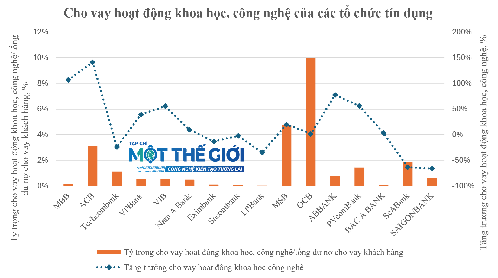 Mặc dù cho vay hoạt động khoa học, công nghệ của Ngân hàng OCB chỉ tăng trưởng 1% (tăng trưởng dư nợ cho vay khách hàng 16,2%), nhưng OCB là ngân hàng có tỷ trọng dư nợ cho nhóm ngành ưu tiên này lớn nhất, 10% tổng dư nợ cho vay khách hàng. Theo sau là MSB (4,7%) và ACB (3,1%). Xét về giá trị, Ngân hàng ACB dẫn đầu về dư nợ cho hoạt động khoa học, công nghệ; tiếp sau là Ngân hàng OCB, MSB, Techcombank, VPBank.
