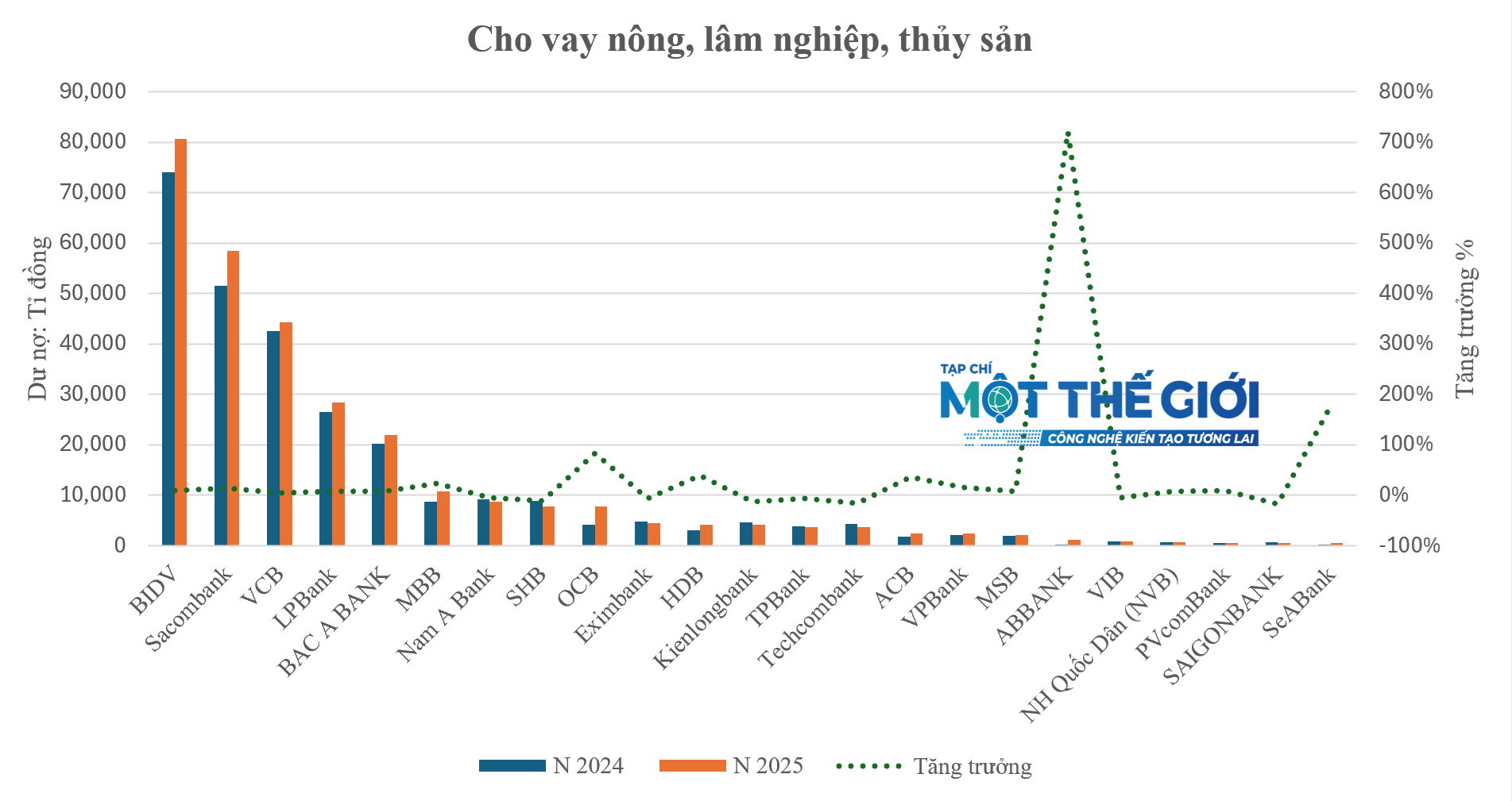 Dẫn đầu tăng trưởng dư nợ cho vay ngành ưu tiên nông nghiệp, lâm nghiệp và thủy sản là Ngân hàng ABBANK (+721%), tiếp theo là SeABank (+177%), OCB (+83,7%), HDBank (+39,5%), ACB (+36,5%). Ngoài ra, có 3 ngân hàng tài trợ vốn cho ngành nông nghiệp, lâm nghiệp, thủy sản tăng 2 con số gồm: MBBank (+23,5%), VPBank (+16%), Sacombank (+13,4%).