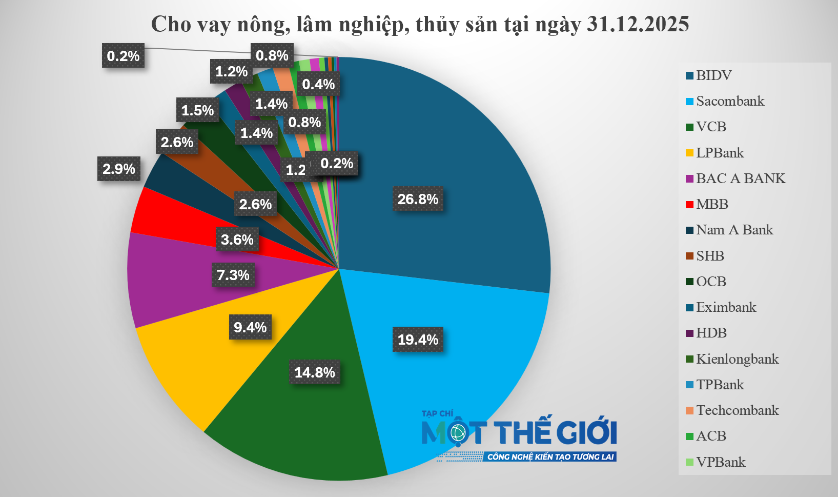 Xét về quy mô (không có Agribank) 5 ngân hàng gồm BIDV, Sacombank, Vietcombank, LPBank, BAC A BANK cung cấp khoảng 78% vốn cho lĩnh vực nông nghiệp, lâm nghiệp và thủy sản trong số 23 ngân hàng thống kê. Nguồn: Số liệu Báo cáo tài chính