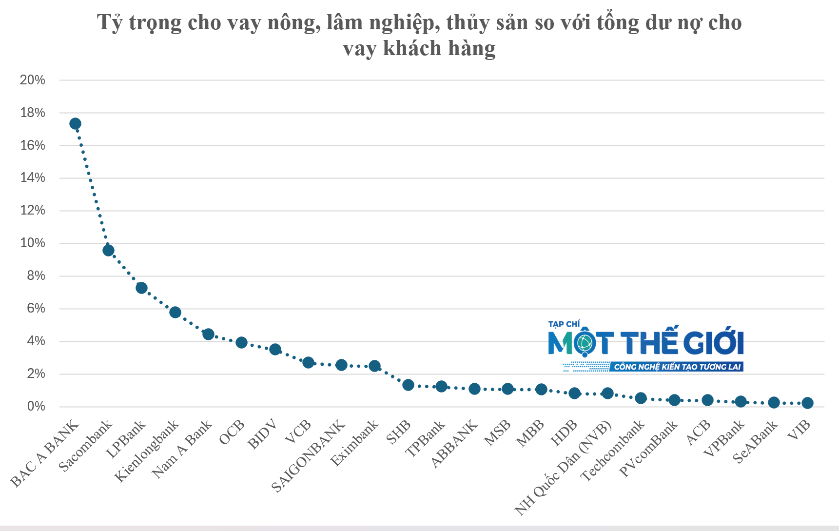 Xét về tỷ trọng cho vay lĩnh vực nông nghiệp, lâm nghiệp và thủy sản, 5 ngân hàng dẫn đầu gồm: Bac A Bank (17,3%), Sacombank (9,6%), LPBank (7,2%), Kienlongbank (5,8%) và Nam A Bank (4,4%). Nhóm 4 ngân hàng Big4 ngoại trừ Agribank không được thống kê, tỷ trọng cho vay nông nghiệp, lâm nghiệp và thủy sản của Ngân hàng MBB thấp nhất, thấp hơn cả trung bình của 23 ngân hàng, đạt mức 1% tổng dư nợ cho vay khách hàng; tiếp sau là Ngân hàng Vietcombank chỉ 2,7%, và Ngân hàng BIDV là 3,5%.