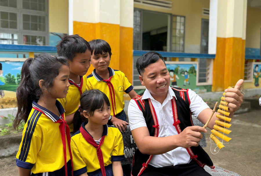 Thầy Nay Khôn giới thiệu về mô hình đàn t’rưng cho học sinh. Ảnh: Lạc Hà