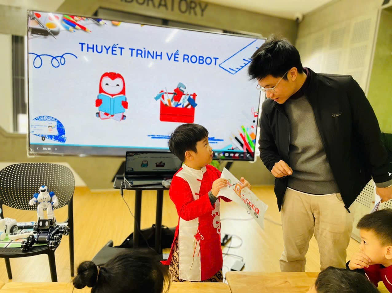 Trong lớp học, Quân không chỉ là một thầy giáo. Anh có thể ca hát, đánh trống, hóa thân thành nhân vật trong truyện hay dẫn dắt các dự án khoa học nhỏ. Khi hướng dẫn trẻ làm robot, giải toán tư duy, thuyết trình bằng tiếng Anh hay sáng chế mô hình, thầy Quân nhận ra: điều quan trọng không chỉ là kiến thức, mà là cách trẻ thêm tự tin và bản lĩnh sau mỗi trải nghiệm.
