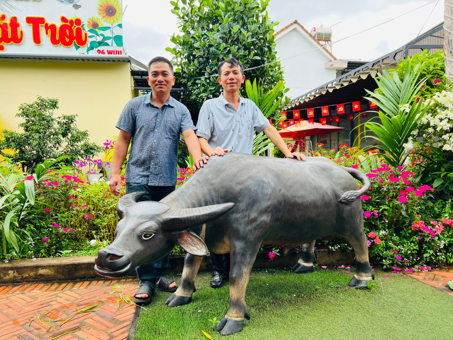 Thầy Nguyễn Văn Xuyền (bìa phải) chia sẻ quá trình làm tượng con trâu bằng xi măng với anh Nguyễn Thành Duy-Chủ quán Cà phê Ánh Mặt Trời. Ảnh: M.N
