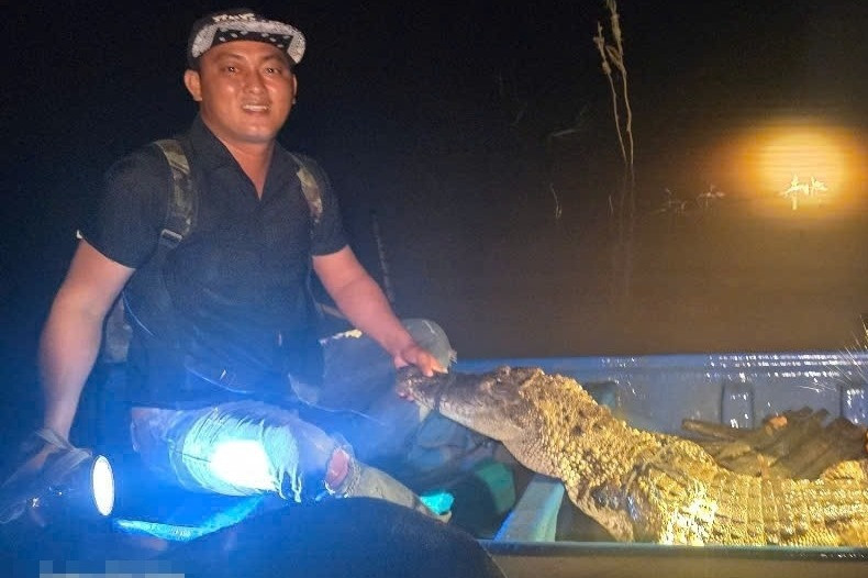Anh Nguyễn Văn Chuyển bắt được cá sấu trên sông Cái Cỏ. Ảnh: HC