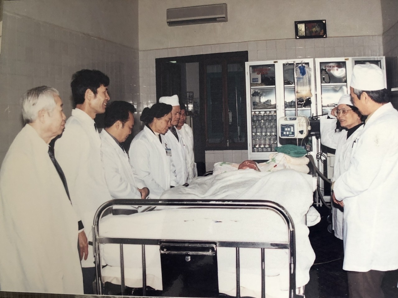 PGS, TS Nguyễn Kim Nữ Hiếu (đứng thứ tư, từ trái sang) cùng các bác sĩ của Bệnh viện Trung ương Quân đội 108 thăm khám bệnh nhân, năm 1999. Ảnh do nhân vật cung cấp