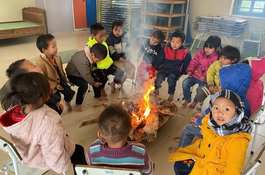 Trẻ ở điểm trường Trảng Phàng 2, Trường Mầm non Sin Suối Hồ được đốt lửa sưởi ấm.