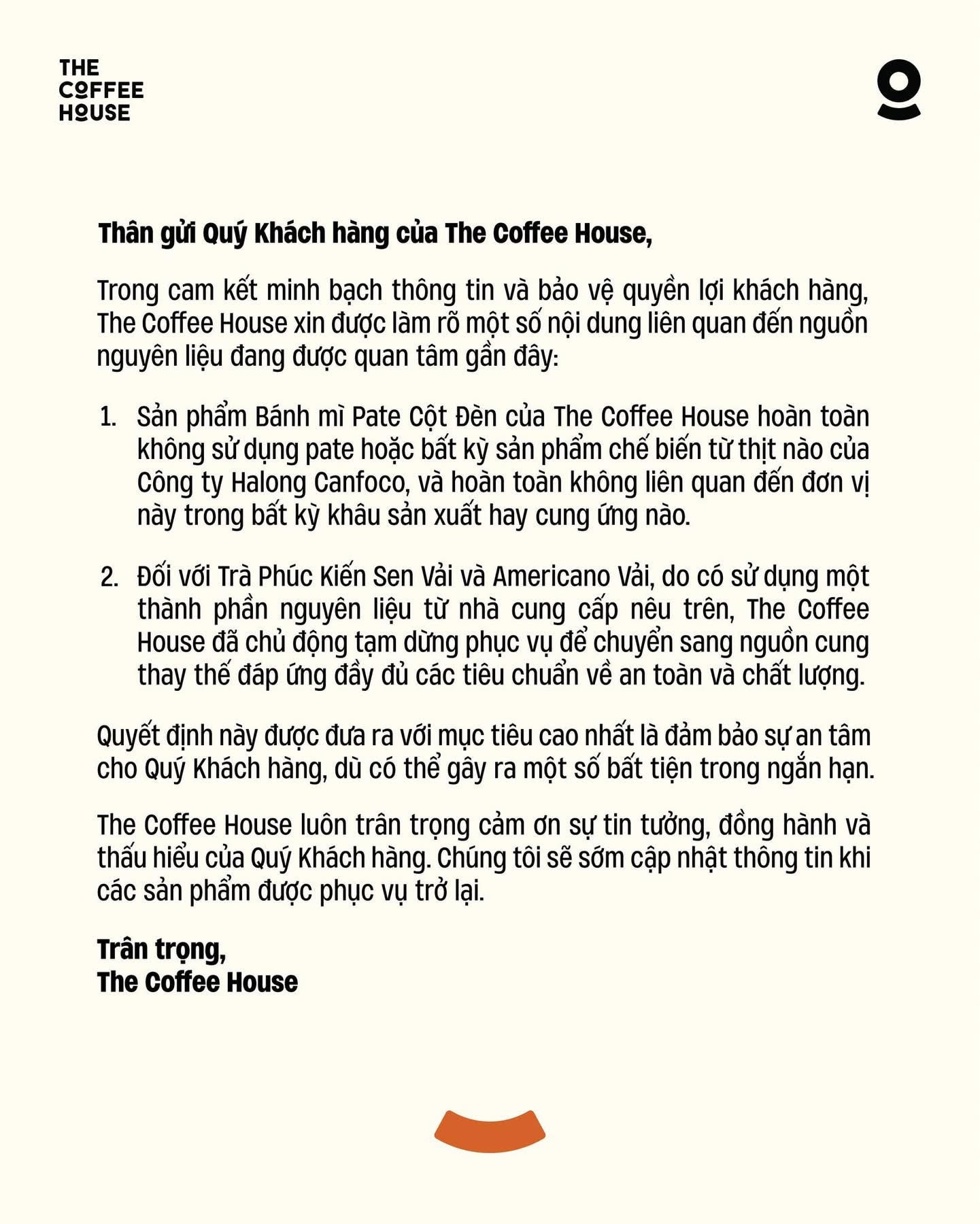 Đối với hai sản phẩm trà phúc kiến sen vải và americano vải, do có sử dụng một thành phần nguyên liệu từ nhà cung cấp nêu trên, The Coffee House đã chủ động tạm dừng phục vụ để chuyển sang nguồn cung thay thế, bảo đảm đáp ứng đầy đủ các tiêu chuẩn về an toàn và chất lượng.