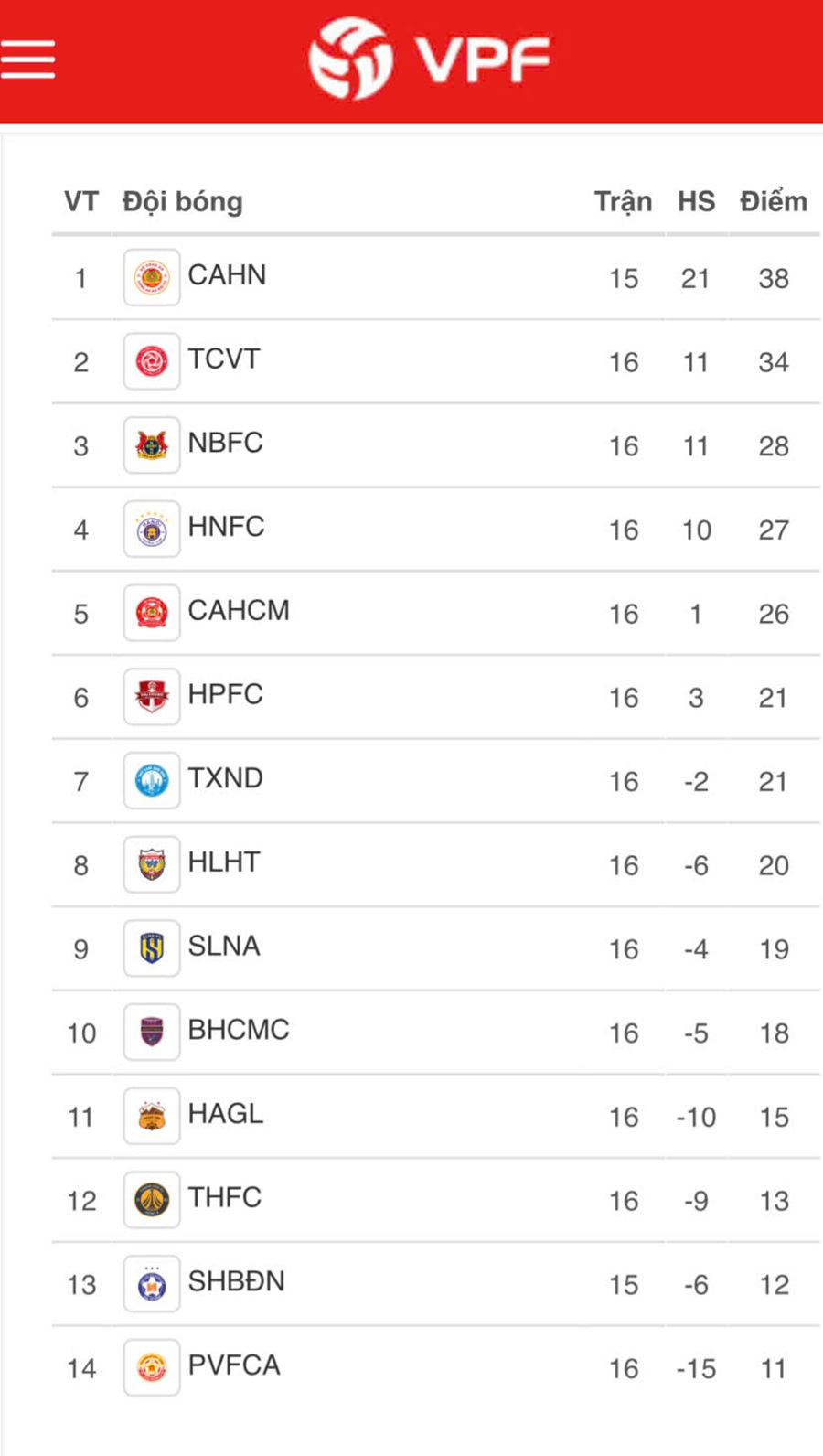 Bảng xếp hạng V-League 2025-2026 tính đến hết vòng 16. Ảnh: VPF