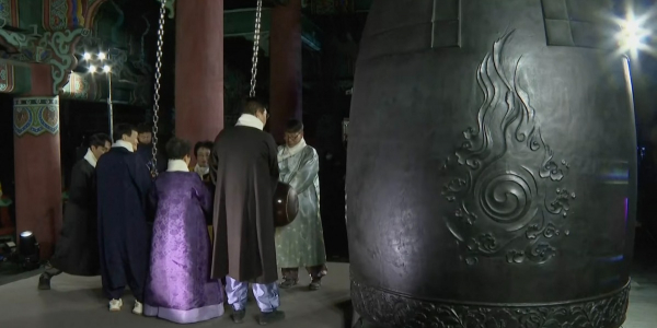 11 công dân tiêu biểu của Seoul, Hàn Quốc thay phiên nhau thực hiện nghi thức đánh chuông tại đền Bosingak đón năm mới 2026. Ảnh: DWS News