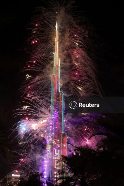 Pháo hoa thắp sáng tòa nhà Burj Khalifa ở Dubai trong những khoảnh khắc đầu tiên của năm mới 2026. Ảnh: Reuters