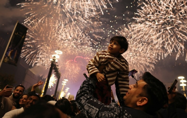 Một cậu bé được cha bế lên để chiêm ngưỡng màn pháo hoa ở Lusail, Qatar. Ảnh: Reuters