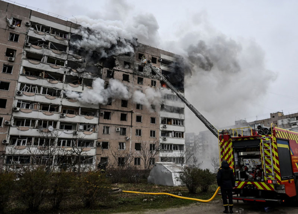 Lực lượng cứu hỏa khống chế đám cháy tại khu chung cư ở Zaporizhzhia, miền Nam Ukraine, sau khi tòa nhà bị trúng bom dẫn đường phóng từ trên không của Nga. Ảnh: Ukrinform/Shutterstock.