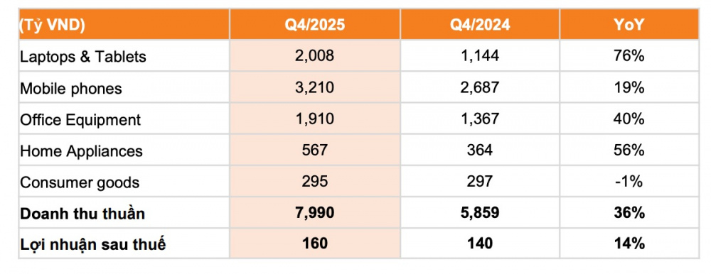 Theo ban lãnh đạo Thế Giới Số, mảng máy tính xách tay và máy tính bảng trong quý 4/2025, ghi nhận doanh thu tăng trưởng đột phá 76% so với cùng kỳ. Kết quả này chủ yếu đến từ nhu cầu nâng cấp các dòng máy tính tích hợp AI cùng với xu hướng chuyển đổi số ngày càng mạnh mẽ.