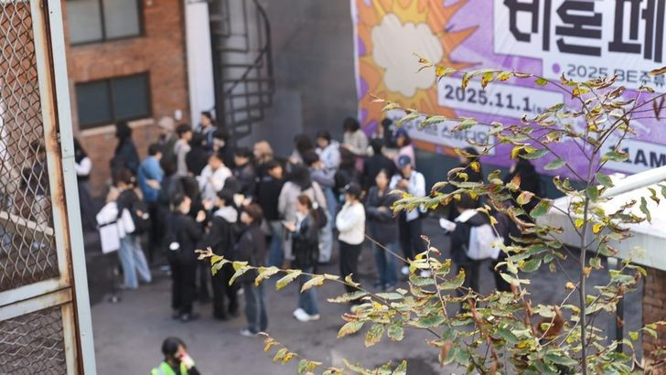 Rất đông nữ giới ở độ tuổi còn trẻ xếp hàng tham dự B-Fair, sự kiện đầu tiên tại Hàn Quốc dành riêng cho phong trào "bihon" tại Seongsu-dong, Seoul.