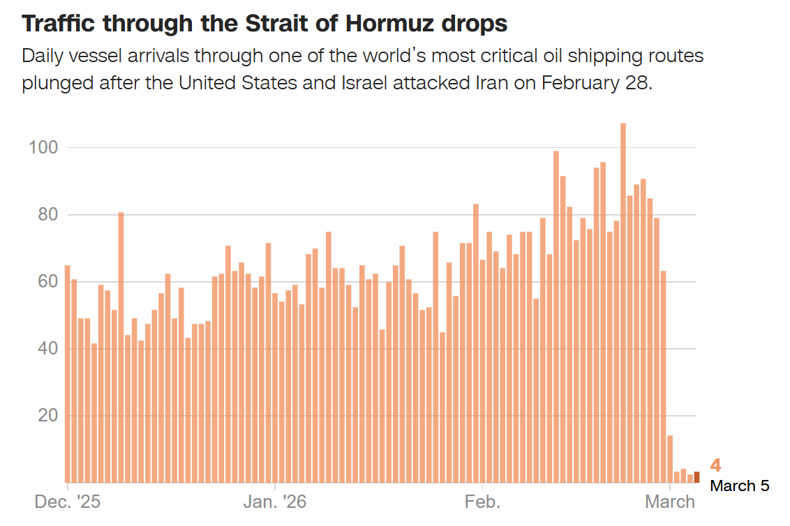 Biểu đồ cho thấy lưu lượng tàu qua eo biển Hormuz đã lao dốc sau khi Mỹ và Israel tấn công Iran vào ngày 28/2. Nguồn: Nguồn: Quỹ Tiền tệ Quốc tế (IMF) - PortWatch. Đồ họa: CNN