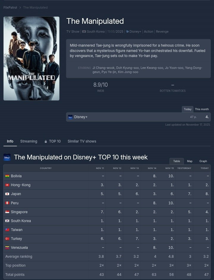 Theo trang thống kê FlixPatrol, tính đến ngày 17/11, lượng người xem của The Manipulated đứng thứ 4 toàn cầu trên mục chương trình truyền hình của Disney+. Đáng chú ý, phim "bá chiếm" hạng 1 ở Hàn Quốc và Đài Loan trong vòng 12 ngày liên tục, cho thấy mức độ quan tâm bùng nổ đối với một phim thuộc thể loại hành động, giật gân.