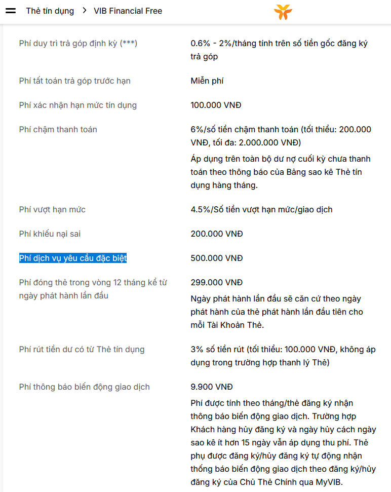 Trong Điều khoản điều kiện phát hành thẻ và Biểu phí thẻ tín dụng VIB, có đề cập đến "phí dịch vụ yêu cầu đặc biệt" với mức phí 500.000 đồng. Tuy nhiên, không có thông tin rõ ràng về việc tại sao người dùng thẻ sẽ bị trừ phí này và phí này sẽ bị trừ trong trường hợp nào. Điều này khiến nhiều người dùng tỏ ra khá bối rối trong quá trình sử dụng thẻ.
