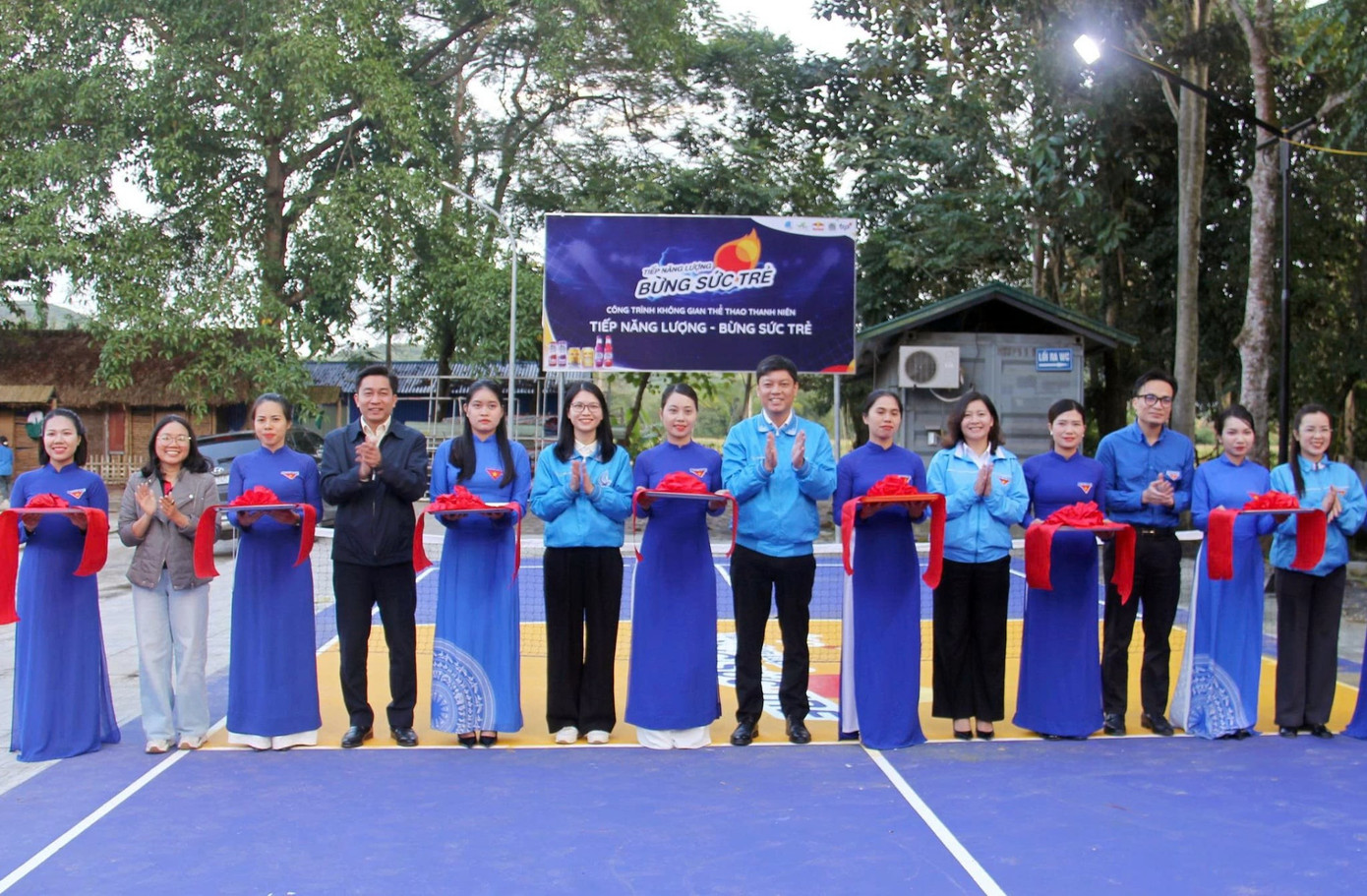 Các đại biểu thực hiện nghi thức cắt băng khánh thành công trình Không gian thể thao thanh niên tại xóm Đuổm.