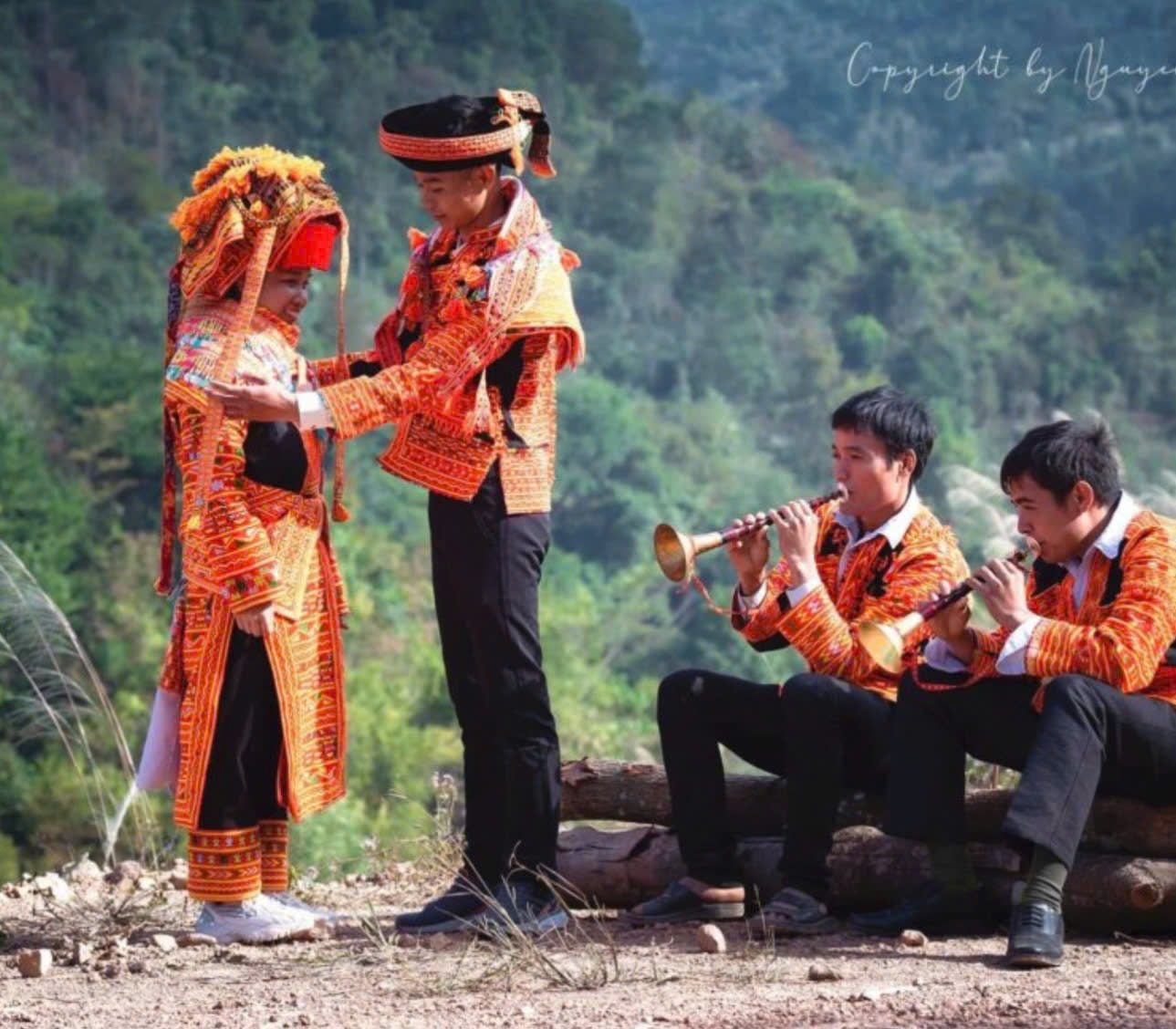 Nghi lễ đám cưới của cô dâu Hoàng Nhung và chú rể Triệu Kim (người Dao) bên đội kèn Pí lè. Ảnh: Nguyễn Sơn Tùng