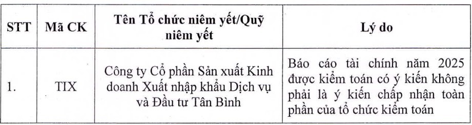 Theo thông báo, Công ty Cổ phần Sản xuất Kinh doanh Xuất nhập khẩu Dịch vụ và Đầu tư Tân Bình (Mã CK: TIX) không đủ điều kiện giao dịch ký quỹ. Lý do được đưa ra là Báo cáo tài chính năm 2025 của doanh nghiệp này được kiểm toán có ý kiến không phải là ý kiến chấp nhận toàn phần của tổ chức kiểm toán.