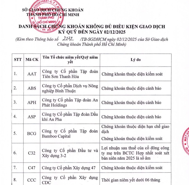 Danh sách các mã chứng khoán không đủ điều kiện giao dịch ký quỹ