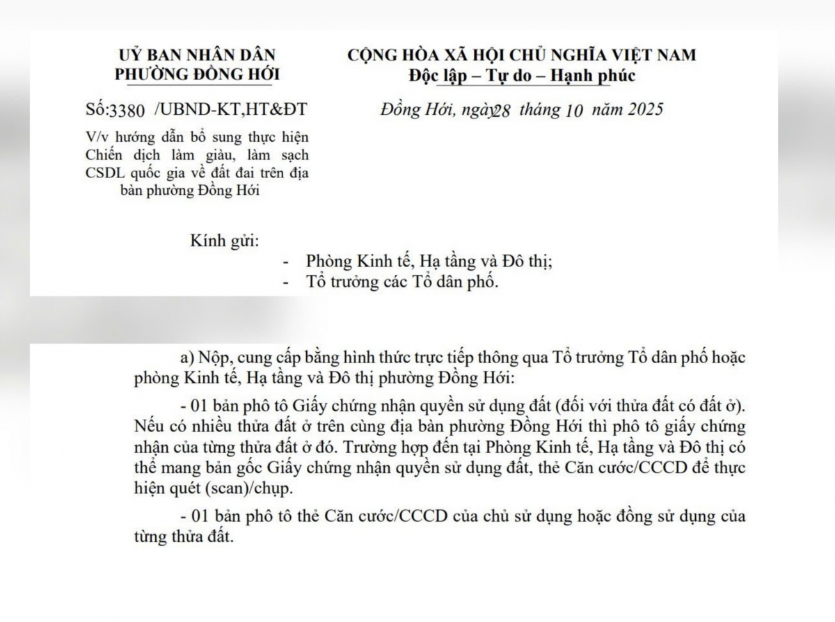 Trước đó, VOV và các cơ quan báo chí đã phản ánh về việc UBND phường Đồng Hới, tỉnh Quảng Trị phát đi thông báo về việc triển khai thực hiện chiến dịch làm giàu, làm sạch cơ sở dữ liệu đất đai trên địa bàn phường này. Mỗi hộ cần nộp một bản photocopy sổ đỏ và một bản photocopy căn cước công dân, nộp trực tiếp cho Tổ trưởng tổ dân phố hoặc gửi file PDF qua Zalo để tổng hợp.
