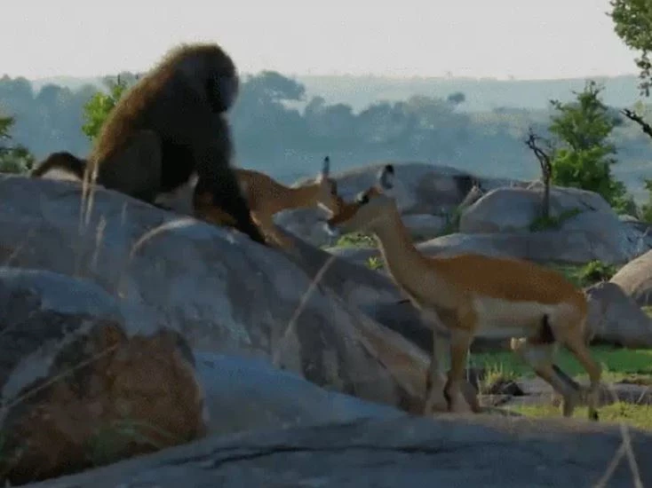 Một con khỉ đầu chó bất ngờ lao tới, bắt sống một con linh dương impala non. Dù con mồi nhỏ bé vùng vẫy tuyệt vọng, còn linh dương mẹ tìm mọi cách tiếp cận để cứu con, tất cả đều bất lực. Con impala non cuối cùng trở thành bữa ăn, giúp khỉ đầu chó thỏa mãn cơn thèm thịt dữ dội, để lại hình ảnh ám ảnh về sự tàn khốc của tự nhiên hoang dã.