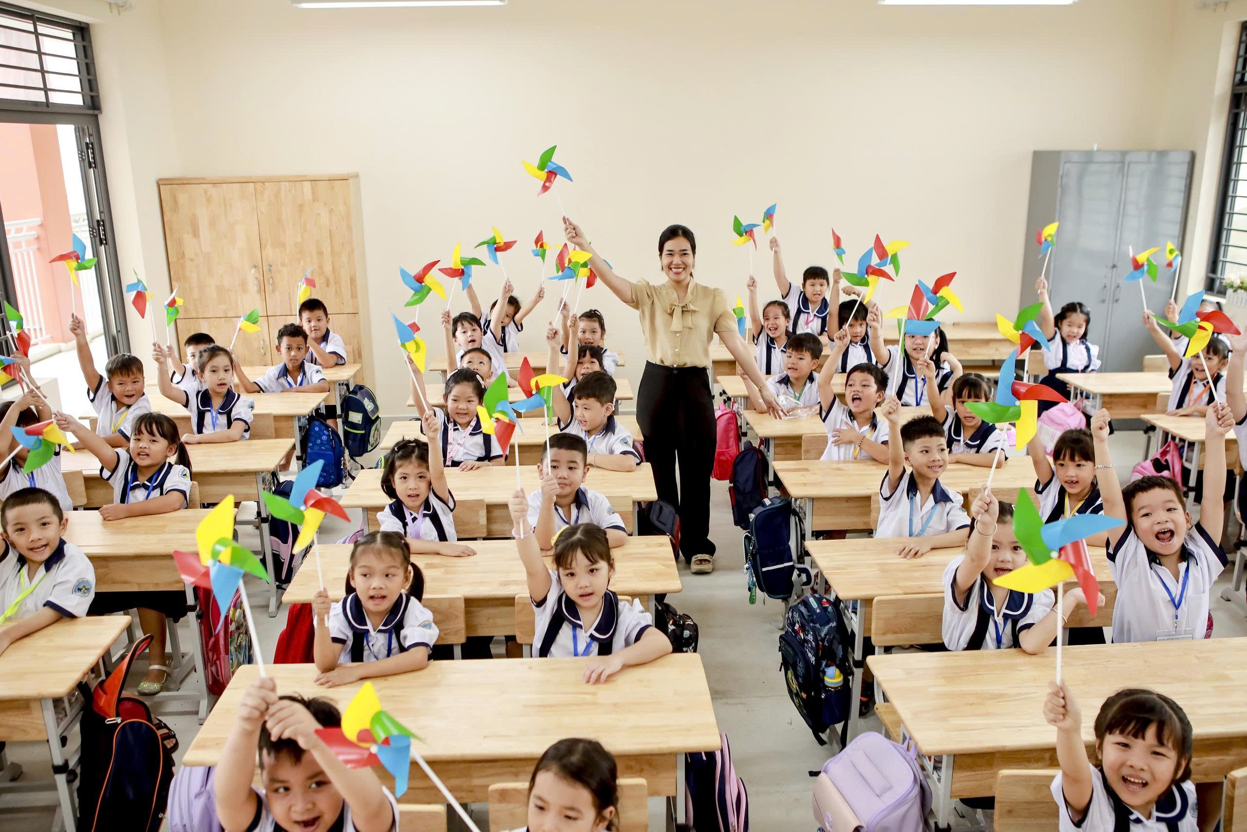 Cô trò trường tiểu học Đặng Thùy Trâm (phường An Hội Tây, TP.HCM) vui vẻ vì được dạy và học trong ngôi trường mới trong năm học 2025-2026. Ảnh: NGUYỄN QUYÊN