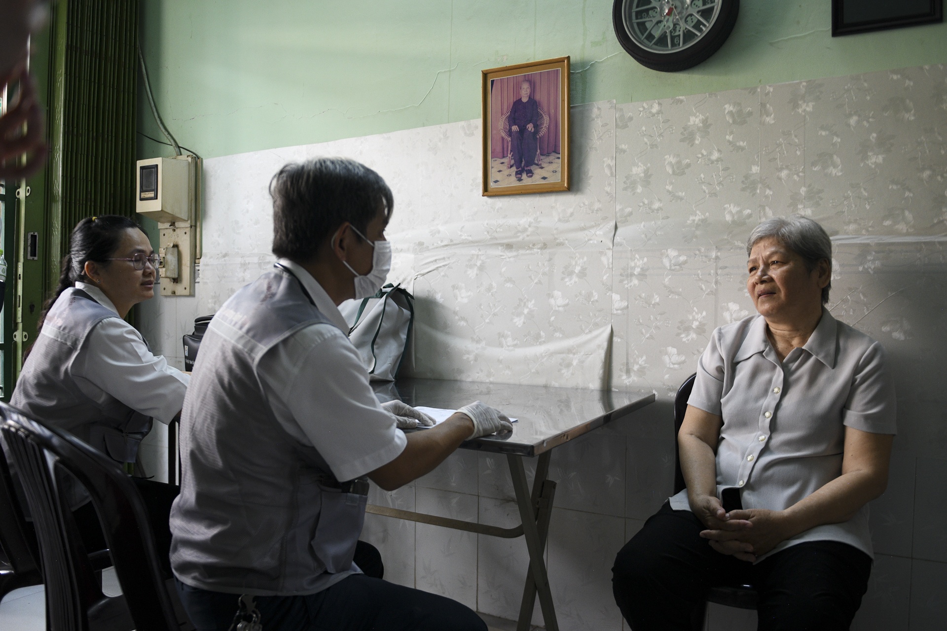 Bà Kiều được bác sĩ Vũ ân cần hỏi thăm về tiền sử bệnh và thói quen sinh hoạt. Từng câu hỏi xoay quanh chế độ ăn uống, việc dùng thuốc và vận động hàng ngày. Bà Kiều chia sẻ cởi mở hơn khi được khám tại nhà. Bác sĩ ghi nhận thông tin và đưa ra nhận định ban đầu. Cuộc trò chuyện trở thành một phần quan trọng trong chăm sóc toàn diện.