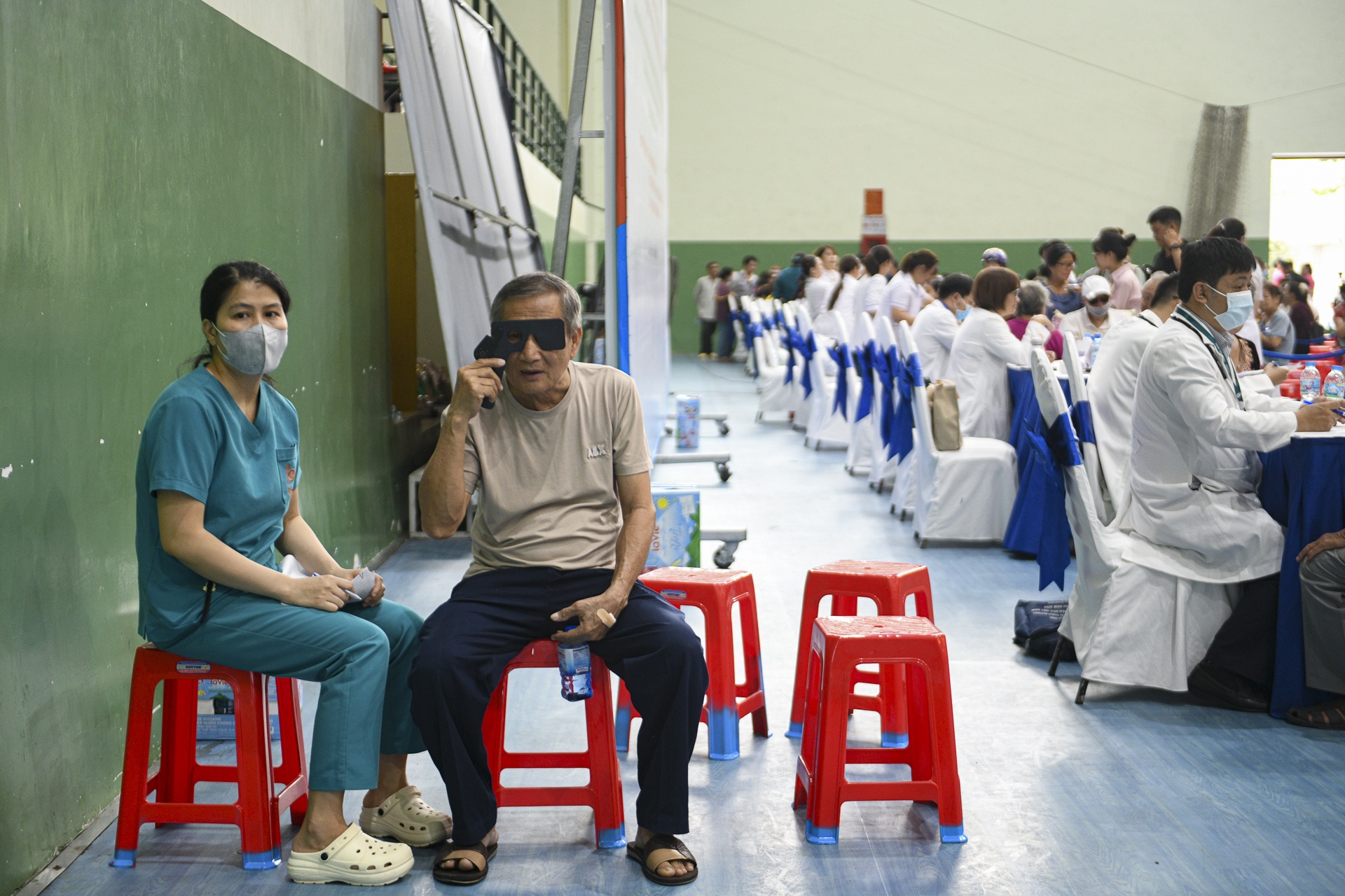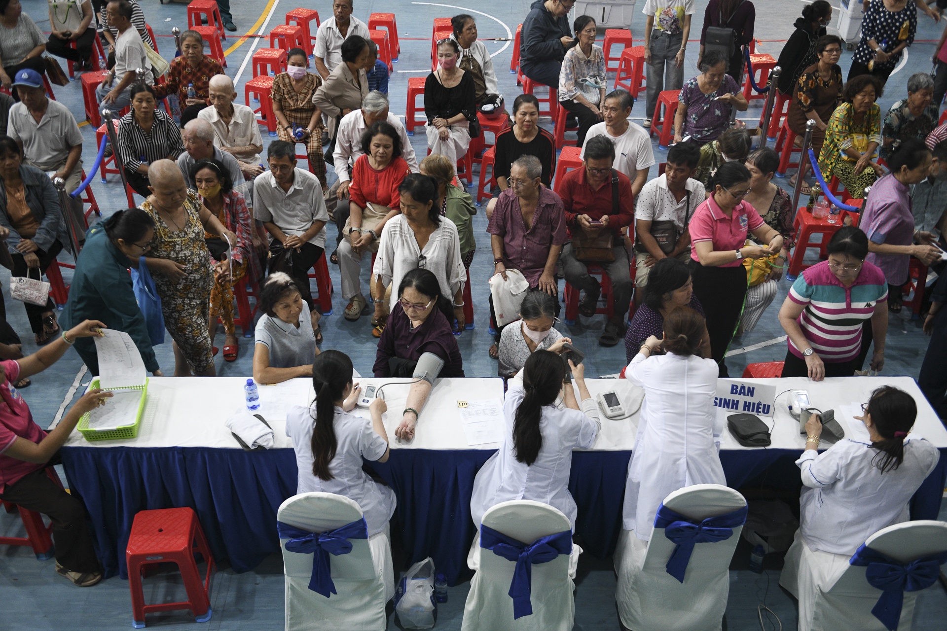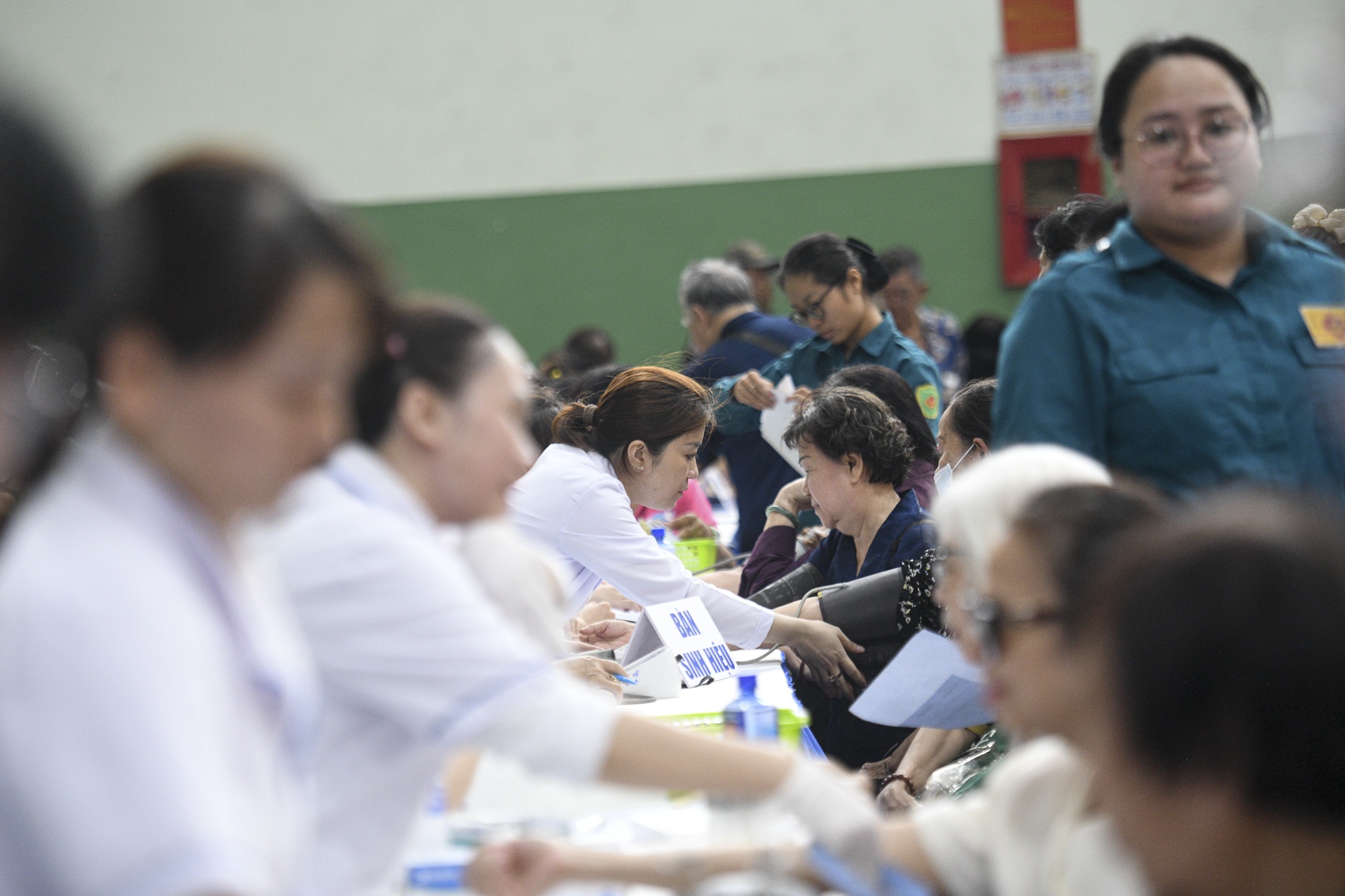 Tại điểm khám cộng đồng Nhà thi đấu phường Bình Phú, không khí diễn ra khẩn trương, đông đảo người dân đến tham gia. Các bàn khám được bố trí khoa học, thuận tiện cho từng khâu sàng lọc. Nhân viên y tế liên tục hướng dẫn, đo sinh hiệu và ghi nhận thông tin. Hình ảnh người dân xếp hàng trật tự cho thấy sự hưởng ứng tích cực của cộng đồng.