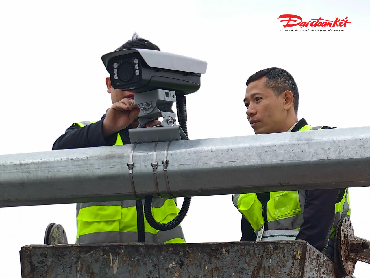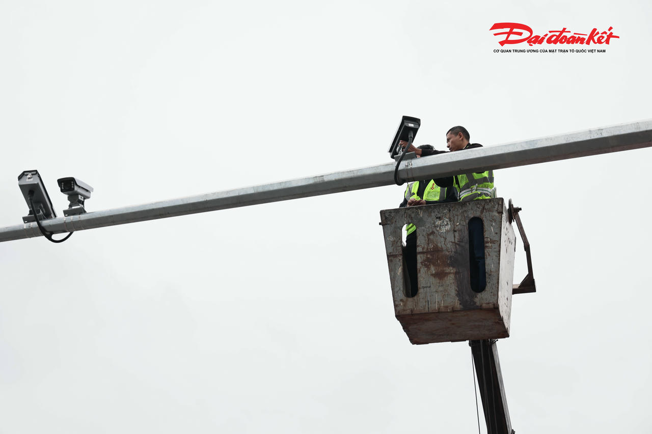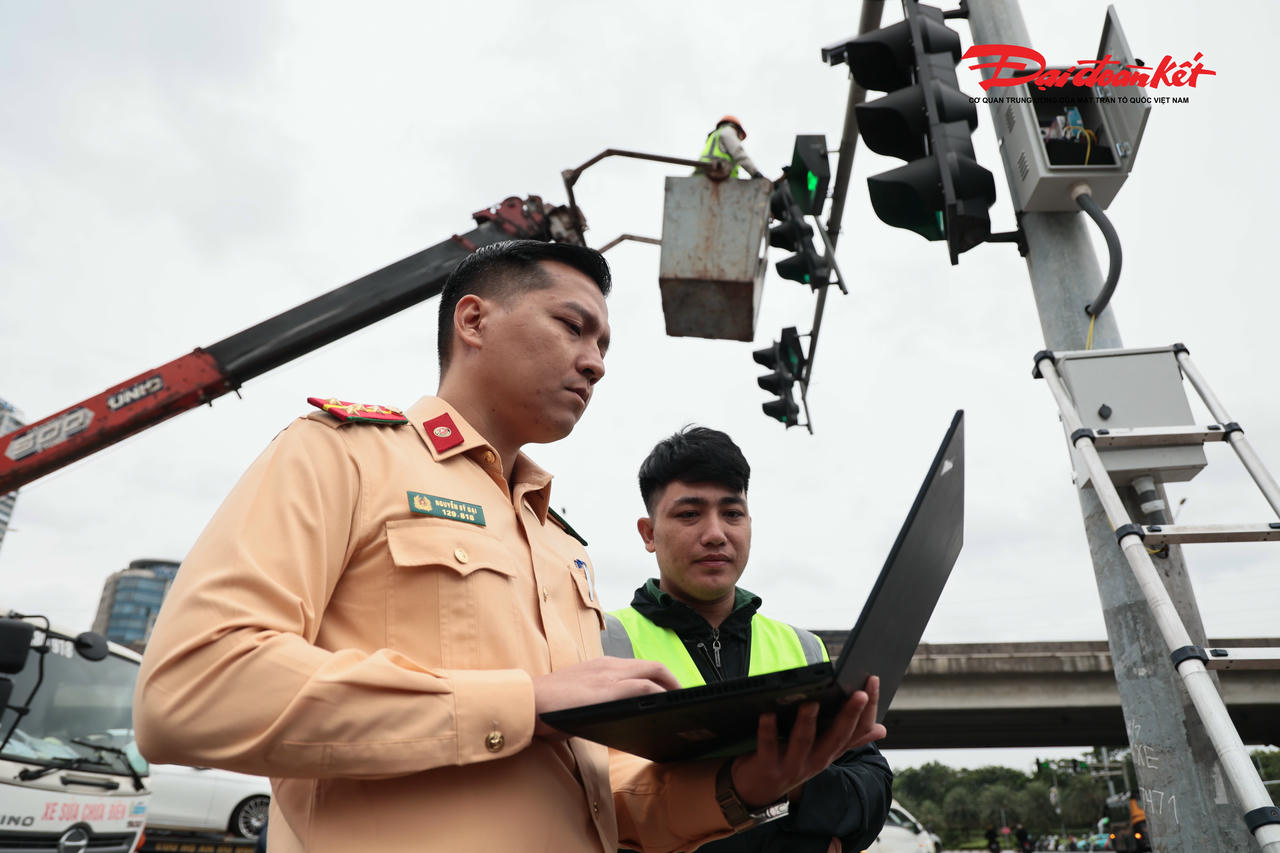 Trước khi lắp đặt camera AI, lực lượng chức năng kiểm tra đường truyền, dây dẫn để điều chỉnh góc máy cho phù hợp với từng tuyến đường, nút giao.