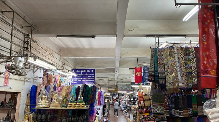 Hình ảnh chợ Talat Sao (Morning Market) – Viêng Chăn với các mặt hàng đồ thủ công, dãy sạp bán sản phẩm địa phương.