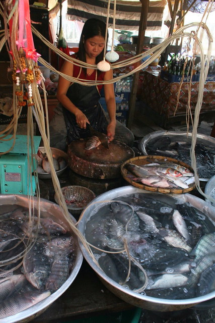 Quầy bán cá và thực phẩm tươi – một góc đời thường của chợ buổi sáng ở Lào.