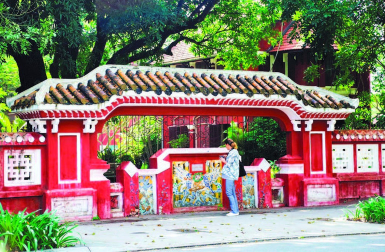Bình phong long mã trước Trường Quốc học Huế được nhiều du khách nước ngoài quan tâm.