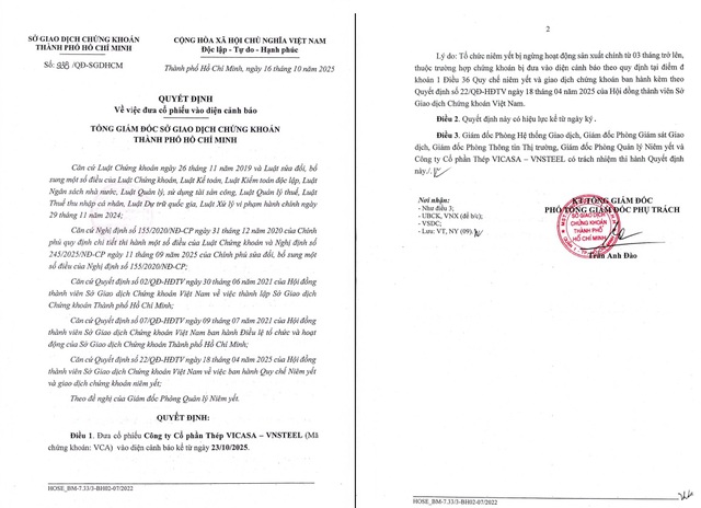 Theo quyết định số 938/QĐ-SGDHCM ngày 16/10/2025 của Sở Giao dịch Chứng khoán TPHCM, cổ phiếu VCA của Công ty Cổ phần Thép Vicasa - Vnsteel (Thép Vicasa), bị đưa vào diện cảnh báo kể từ ngày 23/10/2025.