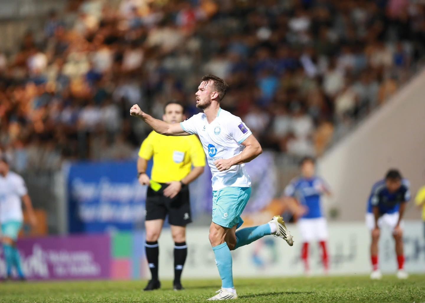 Pha lập công duy nhất của Kristoffer Hansen đã giúp Nam Định đánh bại đội bóng Hong Kong. Ảnh CLB Thép xanh Nam Định