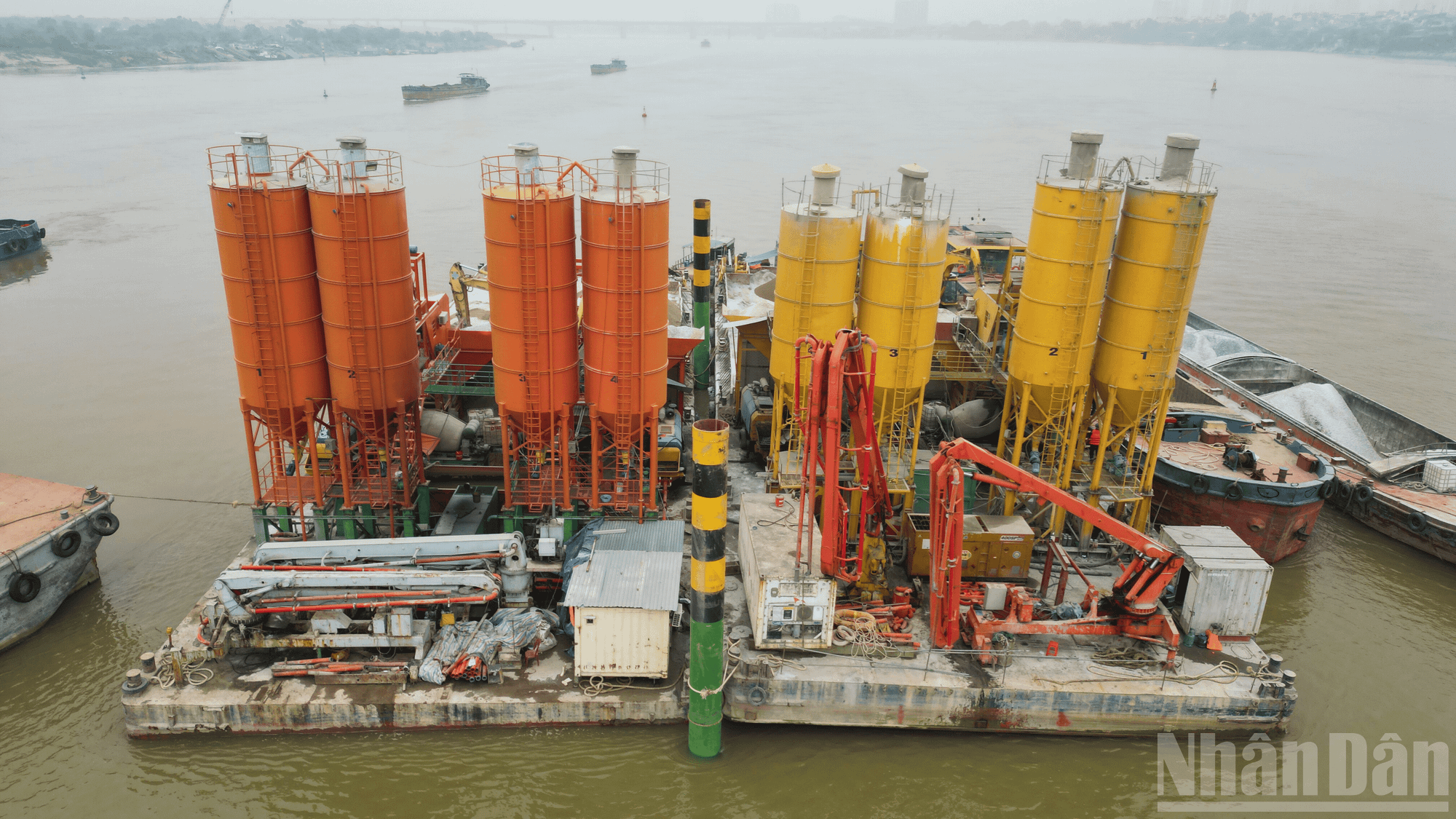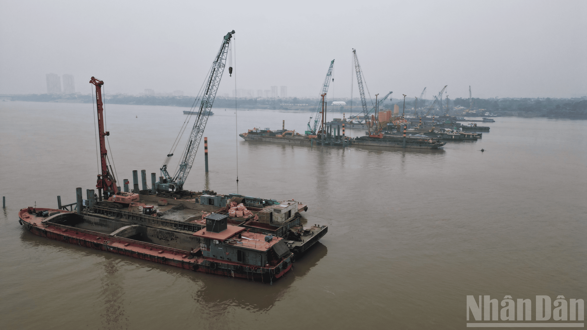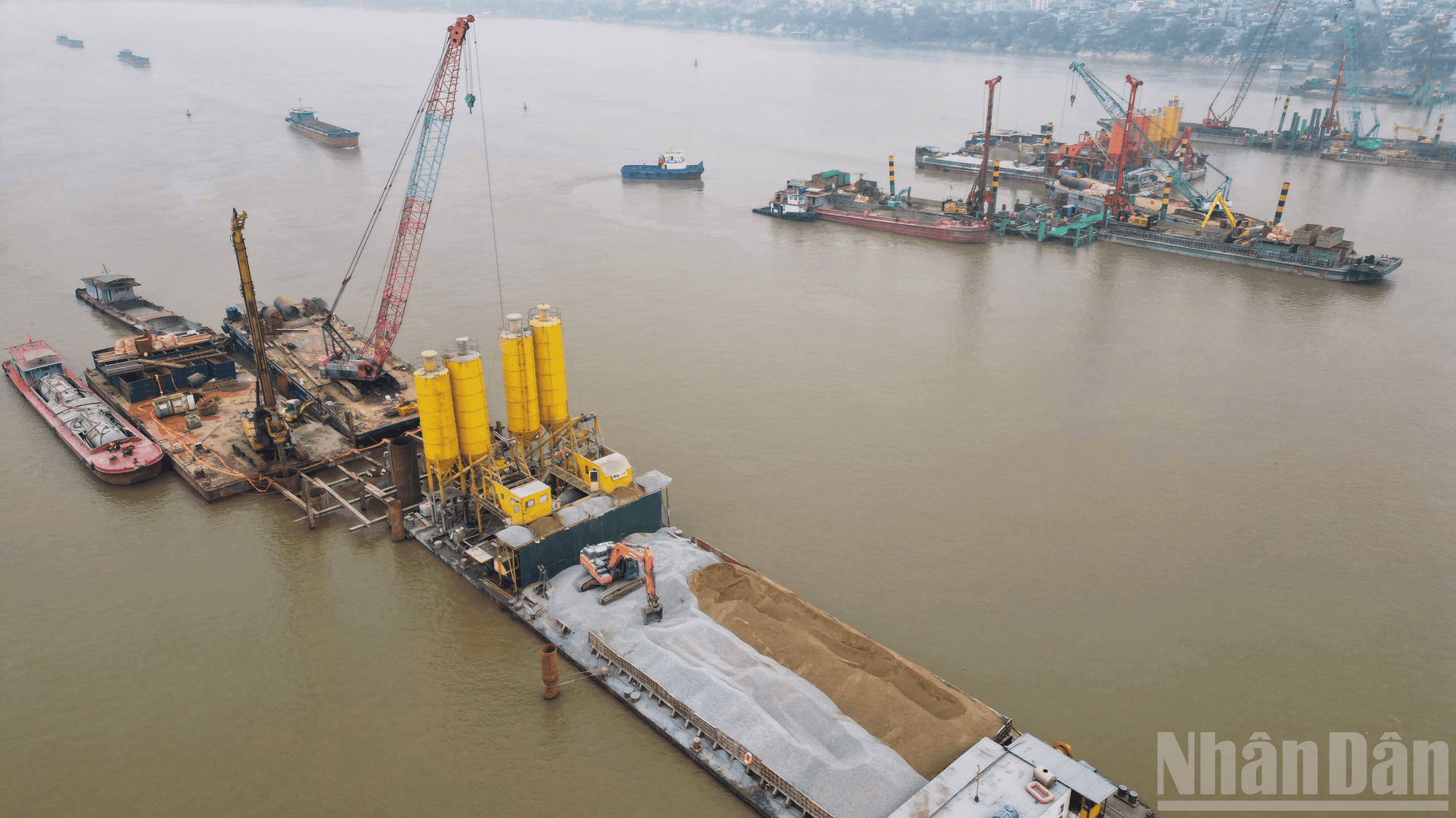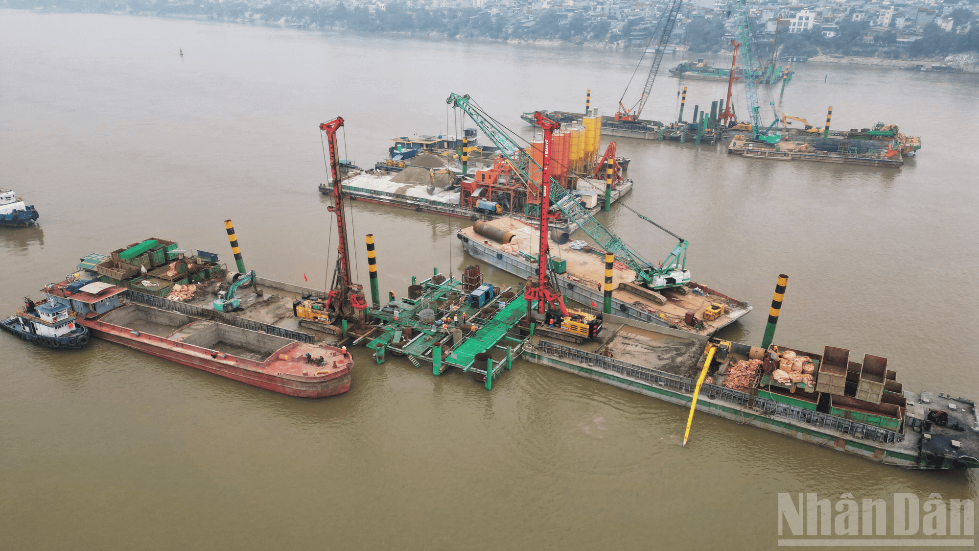Máy móc hoạt động trên sông Hồng nhằm bảo đảm dự án hoàn thành đúng tiến độ.