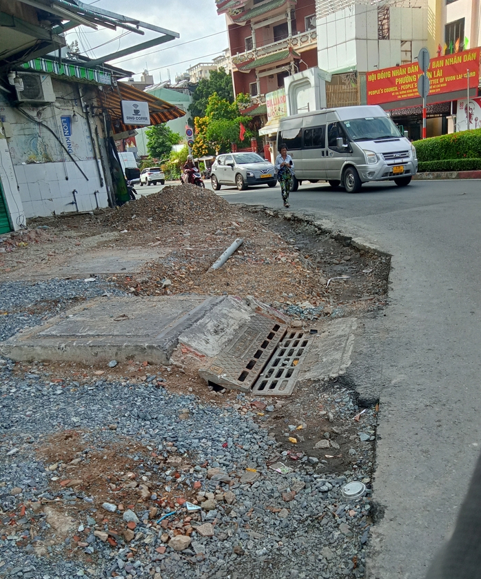 Song, đơn vị thi công không rào chắn, không đặt biển cảnh báo, gây nguy hiểm cho người và phương tiện lưu thông, nhất là vào ban đêm (ảnh). Th.Trần