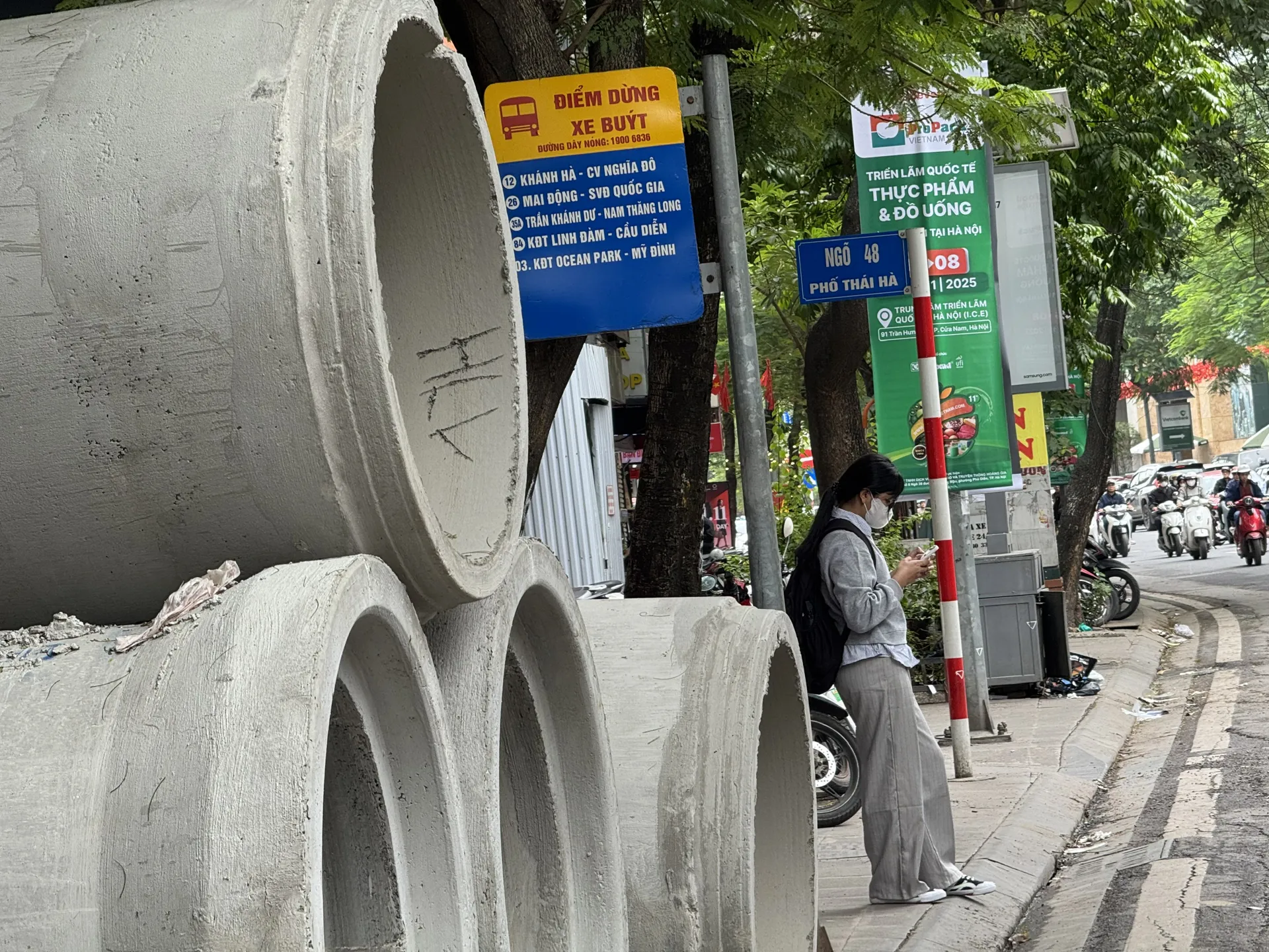 Những ống cống nặng hàng tấn được xếp chồng lên nhau ngay tại điểm chờ xe buýt.