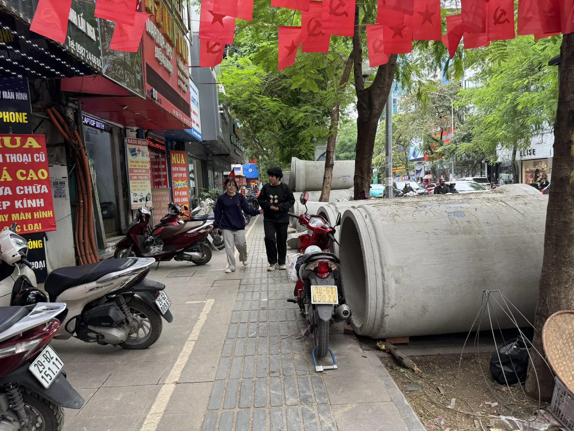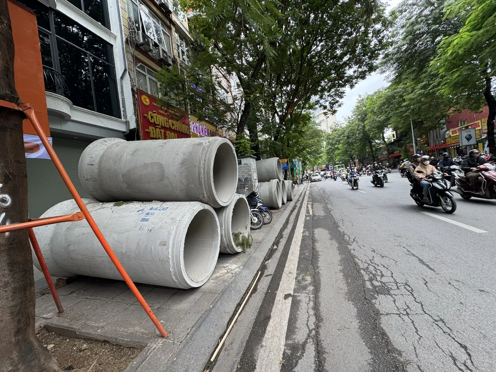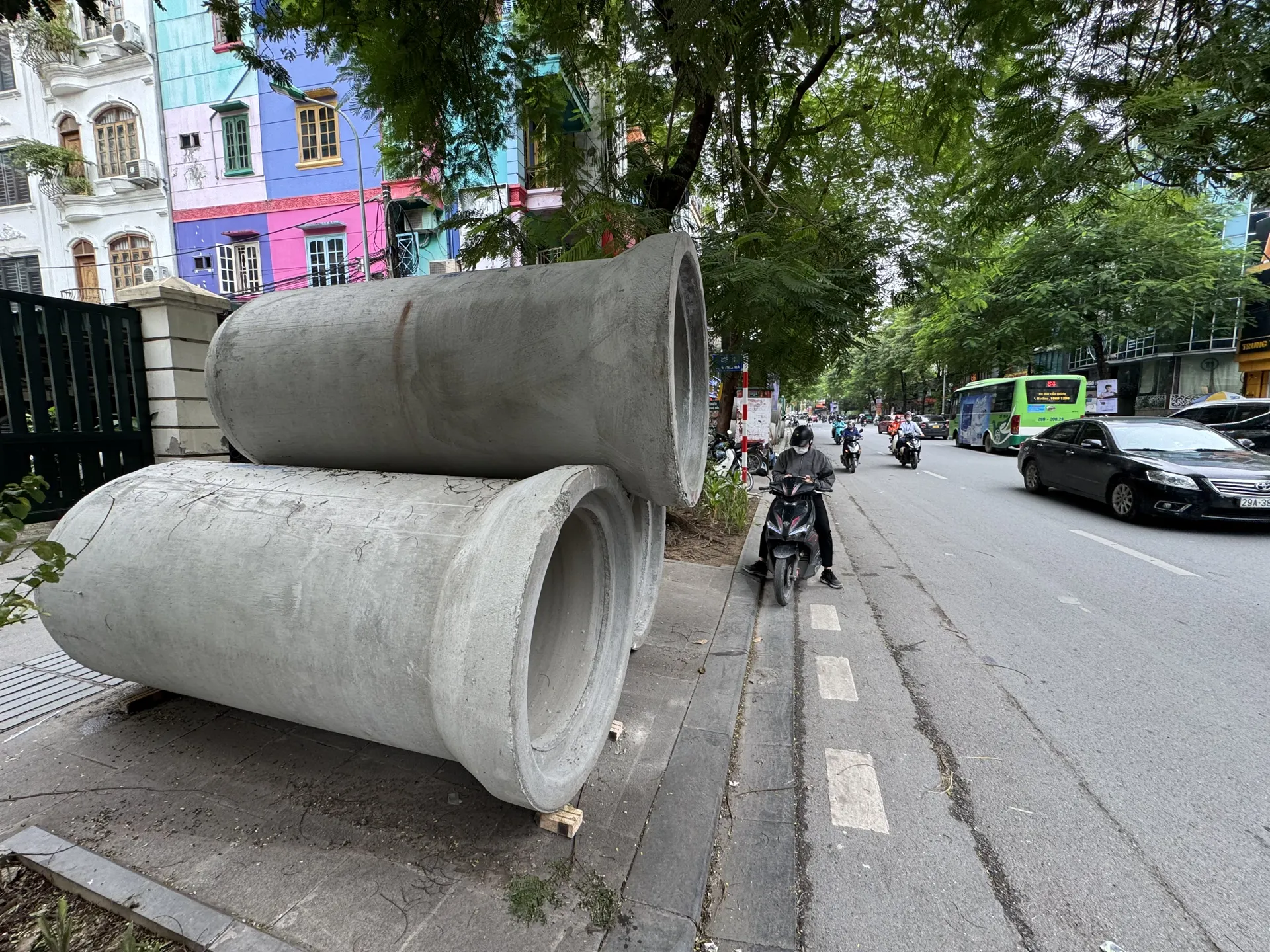 Sáng ngày 5/11, hàng chục ống cống vẫn được tập kết trên vỉa hè phố Thái Hà.