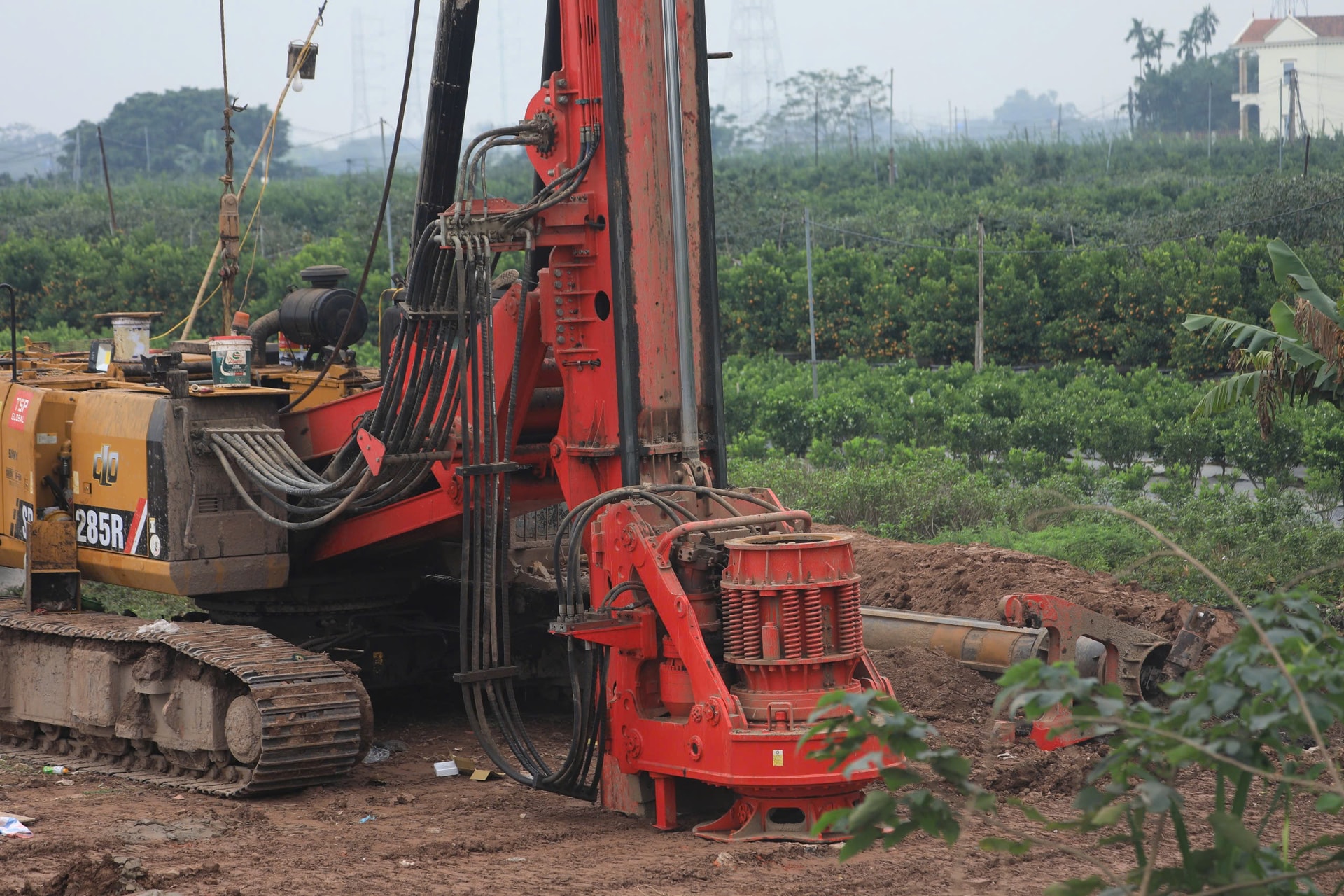 Ghi nhận thực tế tại công trường vào giữa tháng 12/2025, doanh nghiệp dự án - Công ty Cổ phần Đường cao tốc Vành đai 4 Hà Nội - đang tập trung nhân lực và máy móc để thi công cọc khoan nhồi cầu dẫn (hiện thực hiện 23 cọc).