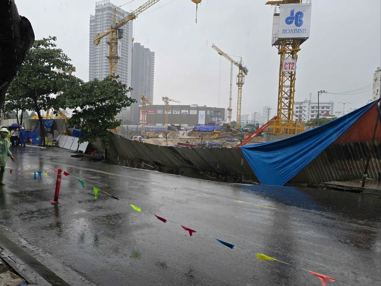 Hiện trường sụt lún trên đường Nguyễn Công Trứ, đoạn sát công trường dự án Capital Square 3 hàng rào tôn bị kéo sập, nền đường bị khoét sâu trong mưa lớn.