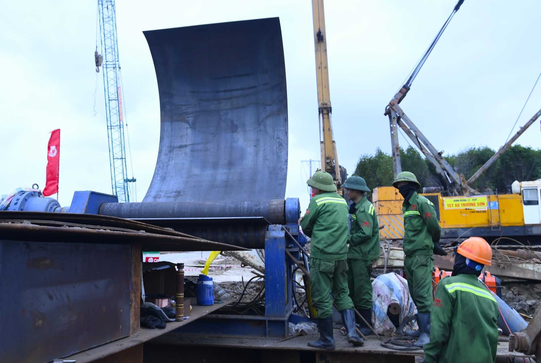 Tại khu vực giáp biển, các đơn vị thi công tận dụng tối đa mặt bằng để làm việc xuyên đêm ngay trong khu vực rừng phòng hộ. Việc tập trung cao độ giúp duy trì nhịp độ công việc ổn định dù điều kiện địa hình phức tạp.