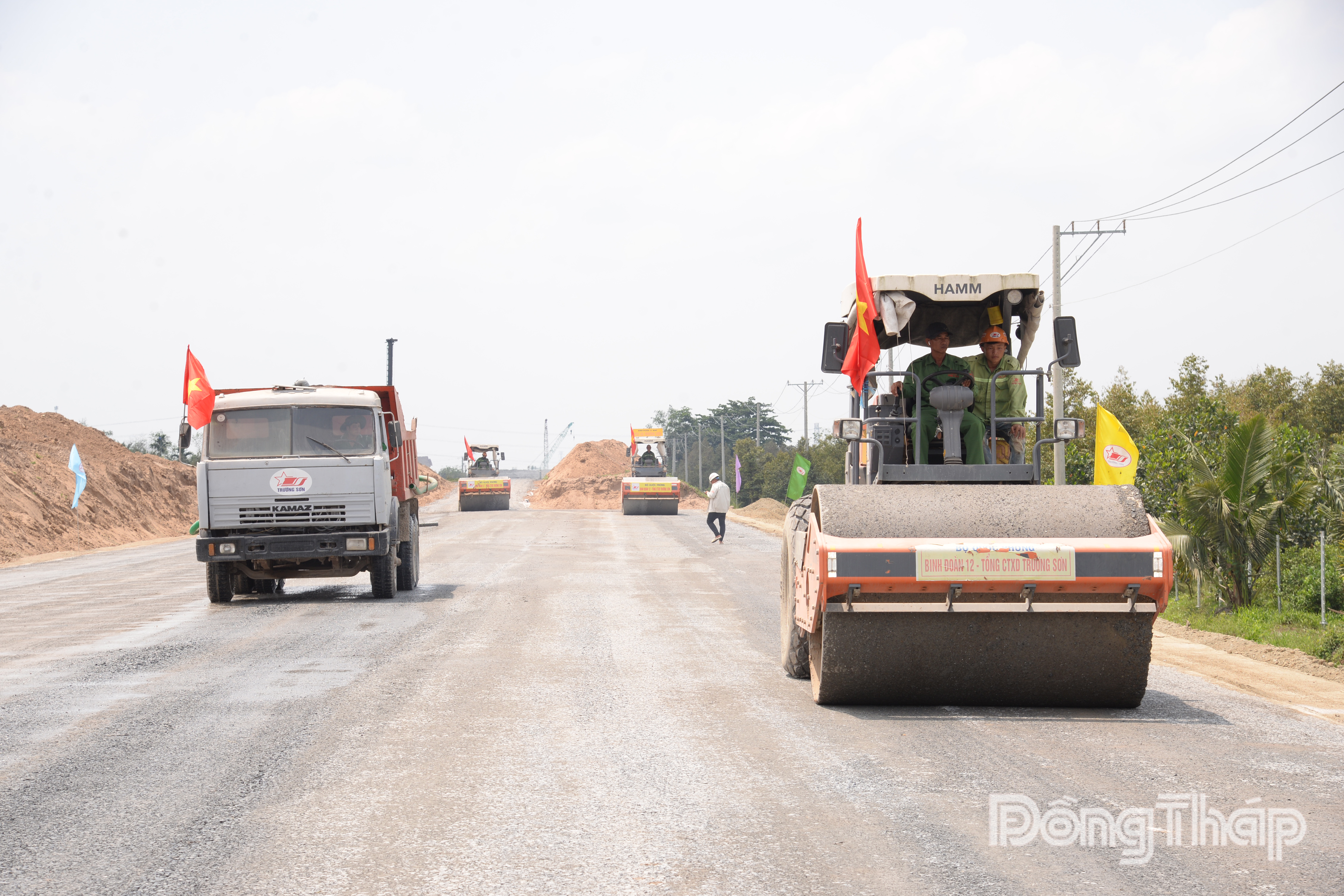 Tại công trường do Tổng Công ty Xây dựng Trường Sơn thi công, không khí làm việc trong trưa 30-4 cũng hết sức khẩn trương. Hàng trăm kỹ sư, công nhân đội nắng bám trụ công trường. Với những đoạn đủ điều kiện, đơn vị đã khẩn trương dỡ tải, thi công cống ngang, cấp phối đá dăm và đắp đất.