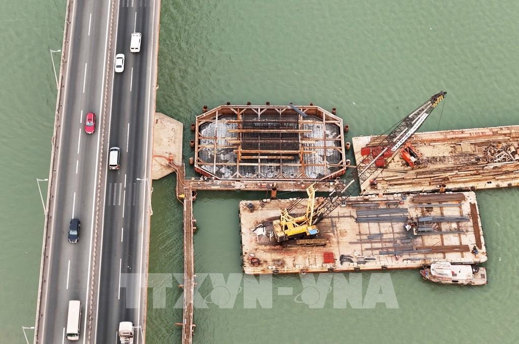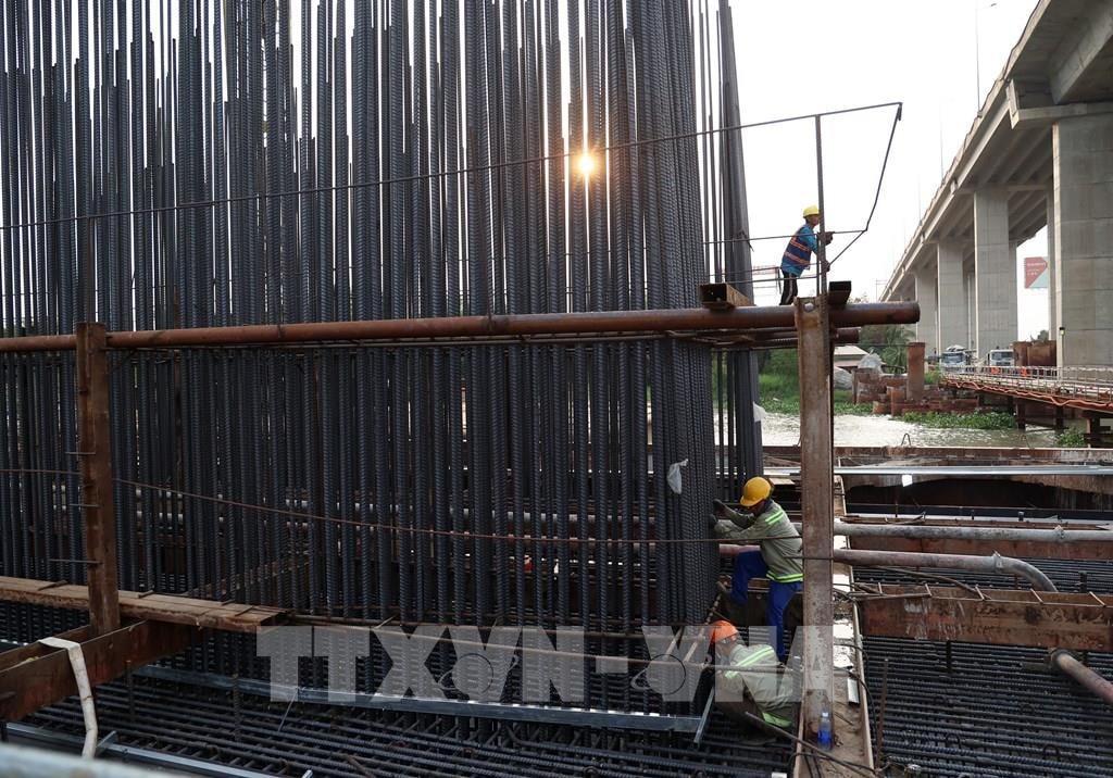 Thi công bệ trụ chính cầu Long Thành. (Ảnh: Hồng Đạt - TTXVN).