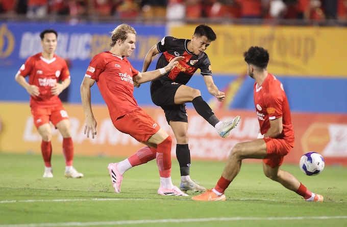 Hoàng Đức chơi nỗ lực nhưng không vượt qua được vòng vây các cầu thủ Thể Công Viettel. Ảnh: Đức Cường