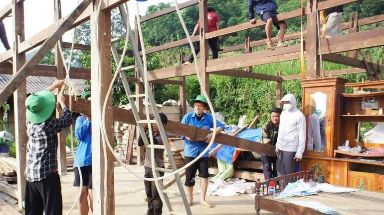 Thái Nguyên hoàn thành xóa nhà tạm, nhà dột nát vượt tiến độ đề ra. (Trong ảnh: Lực lượng tại chỗ xã Quảng Bạch ra quân giúp dựng nhà mới cho hộ nghèo). (Ảnh: TUẤN SƠN).