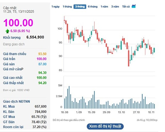 Đáng chú ý, khối lượng giao dịch cũng bùng nổ mạnh. Tính đến chốt phiên sáng, tổng khối lượng giao dịch đạt hơn 6,5 triệu đơn vị, cao gấp nhiều lần so với mức bình quân của các phiên trước đó.