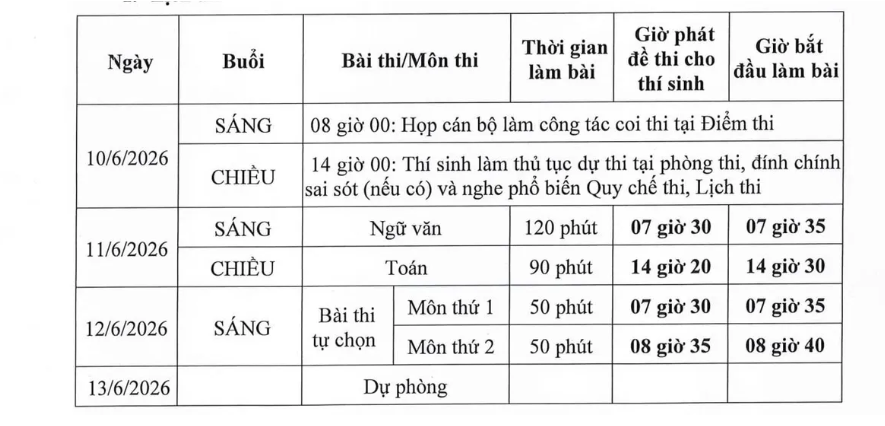 Kỳ thi tốt nghiệp THPT năm 2026 dự kiến diễn ra trong hai ngày 11 và 12/6, sớm hơn khoảng hai tuần so với các năm trước. Thí sinh sẽ dự thi 4 môn, gồm Toán, Ngữ văn (bắt buộc) và 2 môn tự chọn trong số các môn đã học ở bậc THPT.